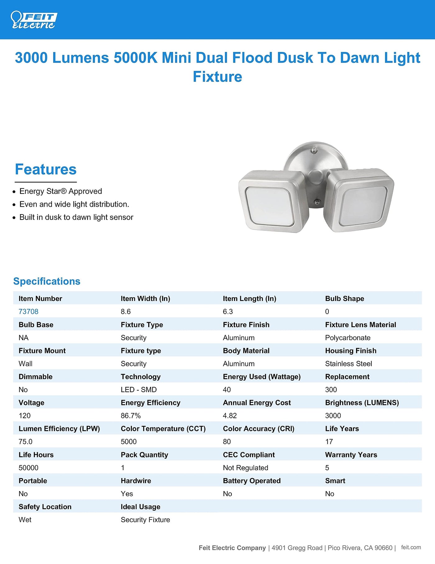 The Feit Electric Mini Dual Head Led Dusk To Dawn Flood Light Provides Added Outside Security Lighting To Any Residential Or Commercial Area. Its Built-In Photocell Sensor Turns 1500 Lumens Of Light On At Dusk And Off At Dawn For Easy Of Convenience And Energy Savings. The Rugged Cast Aluminum Corrosion-Resistant Housing Is Ideal For Outdoor Installation And Has A Dependable Life Of 50, 000 Hours. Universal Junction Box Mounting Plate (Included) Built-In Photocell Sensor Turns Light On At Dusk And Off At Dawn For Convenience And Energy Savings High Quality Shatter Resistant Polycarbonate Lens Provides Enhanced Durability Wet Location Rated Suitable For Use In Open-Air Decks And Patios, Uncovered Porches, And Walkways Etl Listed Includes Install Parts: Junction Box Mounting Plate, Wire Connectors Brightness: 1500 Lumens 5000K (Daylight)Feit Is A Leader In First To Market Lighting Innovations And Driven To Deliver The Latest Breakthrough In Interior And Exterior Illumination. To Us, Lighting Is Everything. The Right Light Can Turn A House Into A Home, Make An Unsafe Area Feel More Secure, And Navigating Your Way Back To Bed A Lot Easier. Our Led Product Portfolio Includes A Full Line Of Energy Efficient Led Bulbs And Retrofit Kits. Feit Electric Also Manufactures Energy-Efficient Led Luminaires Including Ultra-Slim Edge-Lit Ceiling Fixtures, Light-Weight Utility Shop Lights, And Weatherproof Outdoor Led Fixtures. Family Owned. Family Operated. Based In Los Angeles, California Since 1978. We Are Devoted To Our Long-Time Employees, Customers, And Retail Partners - Together, We All Prosper. See More Of Our Feit Family Of Products And Use Your Gift Card Https: // . /Feit/B/Ref=Bl_Dp_S_Web_7494339011?Ie=Utf8&Node=7494339011&Field-Lbr_Brands_Browse-Bin=Feit