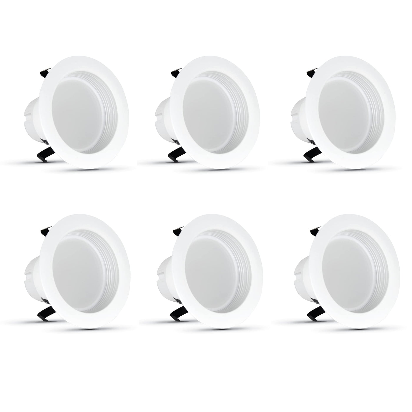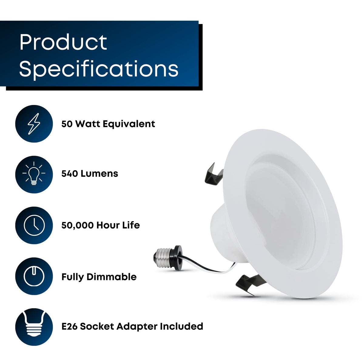Feit Electric LEDR4B/927CA/MP/6 is designed for easy DIY installation, the downlight fits most 4 recessed can housings and comes with a standard base adapter with a baffle trim for trouble-free do-it-yourself installation. This dimmable LED recessed light has a wide range of uses; compatible with most LED dimmers, you can create your favorite space by utilizing the smooth dimming range of 10% - 100%. Giving you 90+ CRI this light can enhance your homes interior and bring colors to life; the colors will remain true and the light output will remain stable through the lifetime of the bulb. This 5000K color temperature simulates full-spectrum light; providing an energizing crisp white light for any room. Feit Electric LED recessed light provides up to 85.6% energy saving by replacing 50W with 7.2W; replace your old incandescent bulbs for a brighter and more energy-friendly home. UL listed, and FCC compliant, Feit Electric upholds the highest standards for all our light bulbs, fixtures, and string lights with optimal performance and safety; with 40+ years of experience in lighting, we are the leader in lighting innovations. This pack includes 6 (six) LED Recessed Lights with a Medium E26 Base adapter; great value along with the convenience and ease of purchase
