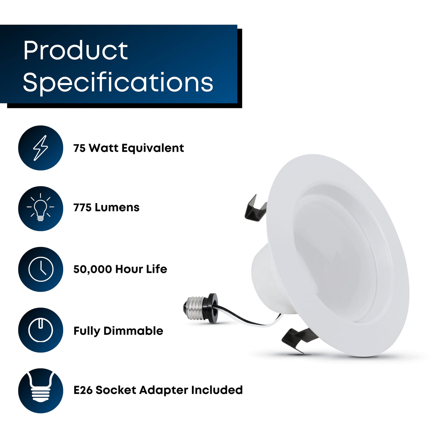 Feit Electric Ledr4Ho/950Ca Is Designed For Easy Diy Installation, This Flat Panel Downlight Fits Most 4'' Recessed Can Housings And Comes With A Standard Base Adapter And A Pre-Mounted Trim. This Dimmable Led Recessed Light Has A Wide Range Of Uses; Compatible With Most Led Dimmers You Are Able Create Your Favorite Space By Utilizing The Smooth Dimming Range Of 10% - 100%. Giving You 90+ Cri This Light Can Enhance Your Home'S Interior And Bring Colors To Life; The Colors Will Remain True And The Light Output Will Remain Stable Throught The Lifetime Of The Bulb. This 5000K Color Temperature Simulates Full Spectrum Light; Providing An Energizing Crisp White Light For Any Room. Feit Electric Led Recessed Light Provides Up To 88.5% Energy Saving By Replacing 75W With 8.6W; Replace Your Old Incandescent Bulbs For A Brighter And More Energy-Friendly Home. Ul Listed And Fcc Compliant, Feit Electric Upholds The Highest Standards For All Our Light Bulbs, Fixtures And String Lights With Optimal Performance And Safety; With 40+ Years Of Experience In Lighting, We Are The Leader In Lighting Innovations