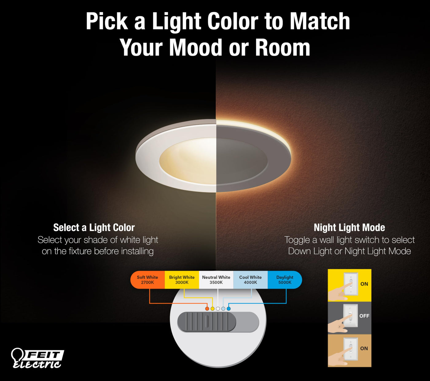 Convert Your Old Recessed Downlights To Advanced Led Energy-Saving Technology With The Ledr4Xt/Ho/Nl/5Cctca Selectable White 4-Inch Canless Recessed Downlight From Feit Electric. This Innovative Recessed Downlight Features Five Selectable Color Temperatures And A 2200K Warm Color Night Light Option. Each Downlight Comes With A Tethered J-Box And Built-In Trim For Installation Directly Into Finished Ceilings Without Recessed Cans. A Dimmable Led Design Produces 850 Lumens Using Only 14 Watts - Up To 81% Less Energy Than An Equivalent 75-Watt Incandescent. Preset Your Preferred Color Temperature Using The Toggle On The Fixture, And Go From Regular Lighting To Night Mode With Just A Flip Of A Standard Light Switch. A 90+ Cri Light Makes Colors Vibrant And Skin Tones Look More Natural, All While Saving Energy And Lasting For A Decade Or More.