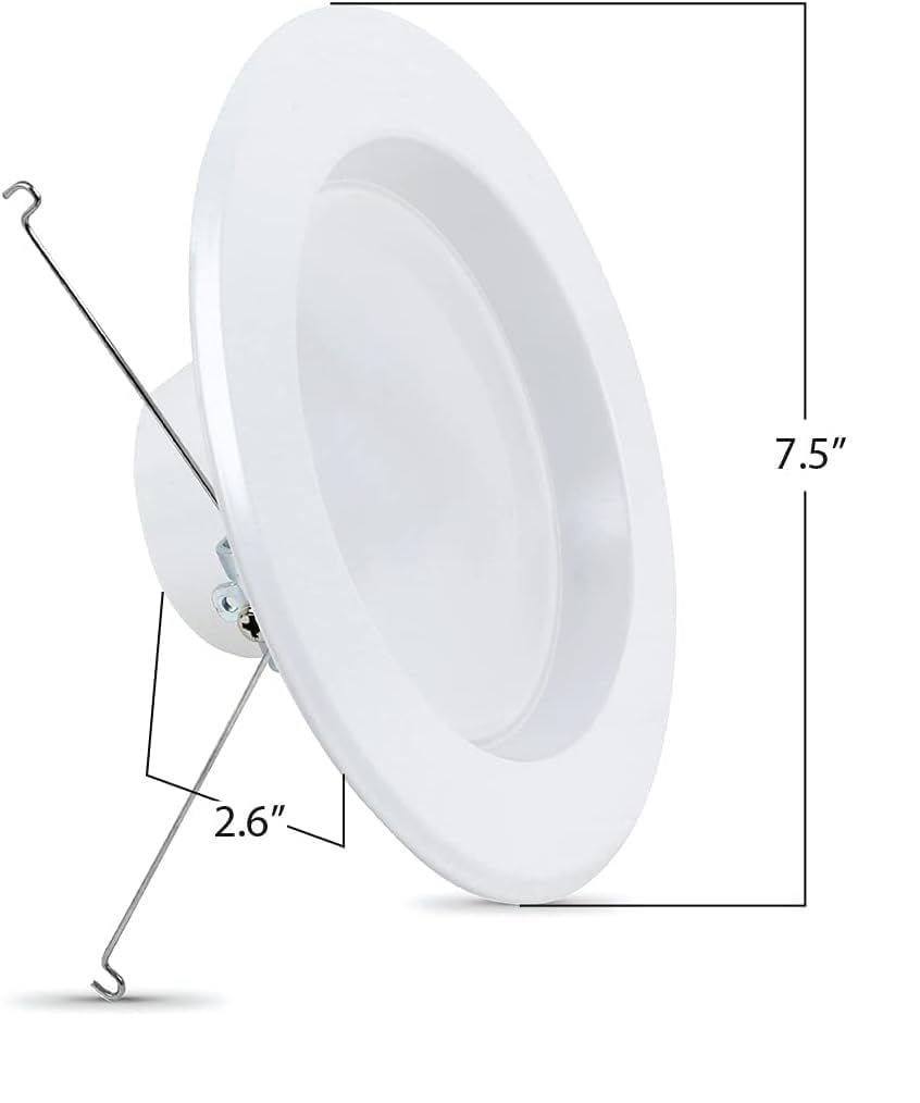 Feit Electric LEDR56/927CA is designed for easy DIY installation, this flat panel downlight fits most 5-6'' recessed can housings and comes with a standard base adapter and a pre-mounted trim. This dimmable LED recessed light has a wide range of uses; compatible with most LED dimmers you are able create your favorite space by utilizing the smooth dimming range of 10% - 100%. Giving you 90+ CRI this light can enhance your home's interior and bring colors to life; the colors will remain true and the light output will remain stable throught the lifetime of the bulb. With this 2700K color temperature it is the warmest option that most closely resembles a standard incandescent blub; giving a warm and cozy feeling and is often best for kitchens, laundry rooms, living rooms, dens and bedrooms. Feit Electric LED recessed light provides up to 86.4% energy saving by replacing 75W with 10.2W; replace your old incandescent bulbs for a brighter and more energy-friendly home. UL listed and FCC compliant, Feit Electric upholds the highest standards for all our light bulbs, fixtures and string lights with optimal performance and safety; with 40+ years of experience in lighting, we are the leader in lighting innovations
