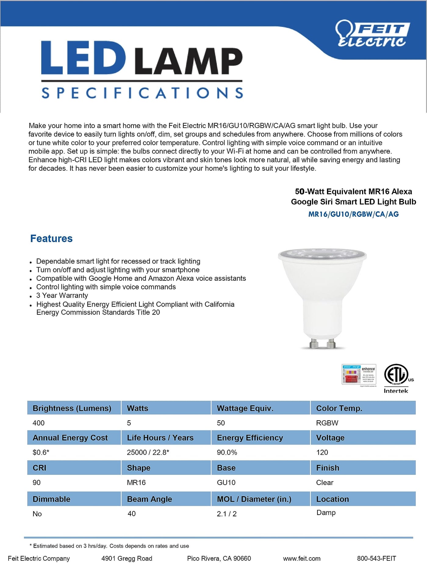 The Feit Electric color changing MR16 smart WiFi LED light bulb works with Alexa or Google Assistant (sold separately) and the Feit Electric Android and iOS mobile app. Easily turn lights on/off, dim, set Groups and schedules using your smartphone or control lighting with simple voice commands. The tunable light feature lets you adjusts light color temperature from relaxing 2700K soft white to energizing 6500K daylight. or you can increase the fun and celebrate by choosing light colors. Set up is simple with no special smart home hub required. The LED light bulb connects directly to your 2.4 GHz WiFi Network at home and can be controlled from anywhere as long as you have access to WiFi or a cellular network. Designed to fit standard light sockets, the GU10 base light bulb is an easy and cost-effective way to introduce smart lighting to your recessed and track lighting. Enhance high-CRI LED light makes colors vibrant and skin tones look more natural, all while saving energy and lasting for decades. It has never been easier to customize your homes lighting to suit your lifestyle. This reliable MR16 smart bulb is RoHS and California Energy Commission title 20 compliant, 100% mercury free and will shine for a decade or more without needing to be replaced. Now you can enjoy the advantages of energy saving LED with the convenience of smart home technology. Make your home into a smart home with the Feit Electric MR16/GU10/RGBW/CA/AG smart light bulb.