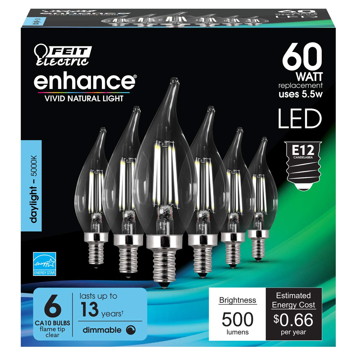 This 6 pack of decorative Feit Electric LED candelabra bulbs are dimmable and will replace 60 watt equivalent incandescent bulbs. The classic chandelier flame tip LED bulb produces a 90+ CRI which makes colors vibrant and skin tones look more natural and similar light output of 500 lumens while only using 5. 5 watts of electricity and up to 91% less energy than a standard incandescent light bulb. Designed to fit candelabra sockets, the versatile E12 base light bulbs makes it easy to add an elegant traditional touch to your chandelier, lantern, wall sconces, and more. No warming up or delay in illumination with instant on full bright lighting and relatively cool running performance. Feit Electric decorative LED bulbs have an average life of 15000 hours / 13 years are RoHS compliant, California Title 20 Compliant (CEC) and are 100% mercury free. Specifications: ?? Color temperature: 5000K ?? Brightness: 500 Lumens ?? Watt equivalent: 60 Watts ?? Watt: 5. 5 Watts ?? Dimmable: Yes ?? UL-Listed: Yes ?? Life Hours: 15000. Feit is a leader in first to market lighting innovations and driven to deliver the latest breakthrough in interior and exterior illumination. To us, lighting is everything. The right light can turn a house into a home, make an unsafe area feel more secure, and navigating your way back to bed a lot easier. Our LED product portfolio includes a full line of energy efficient LED bulbs and retrofit kits. Feit Electric also manufactures energy-efficient LED luminaires including ultra-slim edge-lit ceiling fixtures, light-weight utility shop lights, and weatherproof outdoor LED fixtures. Family owned. Family operated. Based in Los Angeles, California since 1978. We are devoted to our long-time employees, customers, and retail partners - together, we all prosper. See more of our Feit family of products on our Storefront.