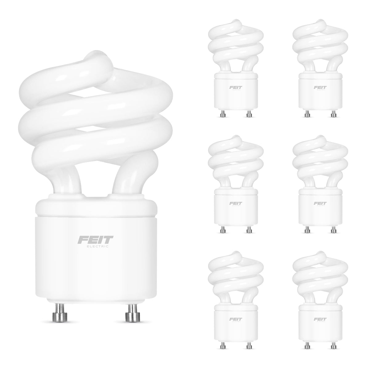 The Feit Electric 6-pack BPESL13T/GU24/41K 60W Mini Twist GU24 Base CFL 4100K cool white light is non-dimmable and will replace a 60-watt equivalent incandescent bulb. It produces a similar light output of 900 lumens, uses 13 watts of electricity and up to 78% less energy than a standard incandescent light bulb. This compact fluorescent light is ideal for ceiling fans, chandeliers, table lamps, or wall sconces. Feit Electric CFL bulbs have a relatively cool running performance, an average life of 10, 000 hours / 9. 1 years and are RoHS / FCC compliant. Choose a dependable, general purpose lighting bulb for residential or commercial applications. To us, lighting is everything. The right light can turn a house into a home, make an unsafe area feel more secure, and navigating your way back to bed a lot easier. Our LED product portfolio includes a full line of energy efficient LED bulbs and retrofit kits. Feit Electric also manufactures energy-efficient LED luminaire including ultra-slim edge-lit ceiling fixtures, light-weight utility shop lights, and weatherproof outdoor LED fixtures. Family owned. Family operated. Based in Los Angeles, California since 1978. We are devoted to our long-time employees, customers, and retail partners-together, we all prosper. see more of our Feit family of products on Feit Store.