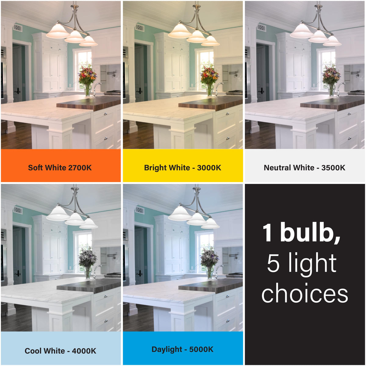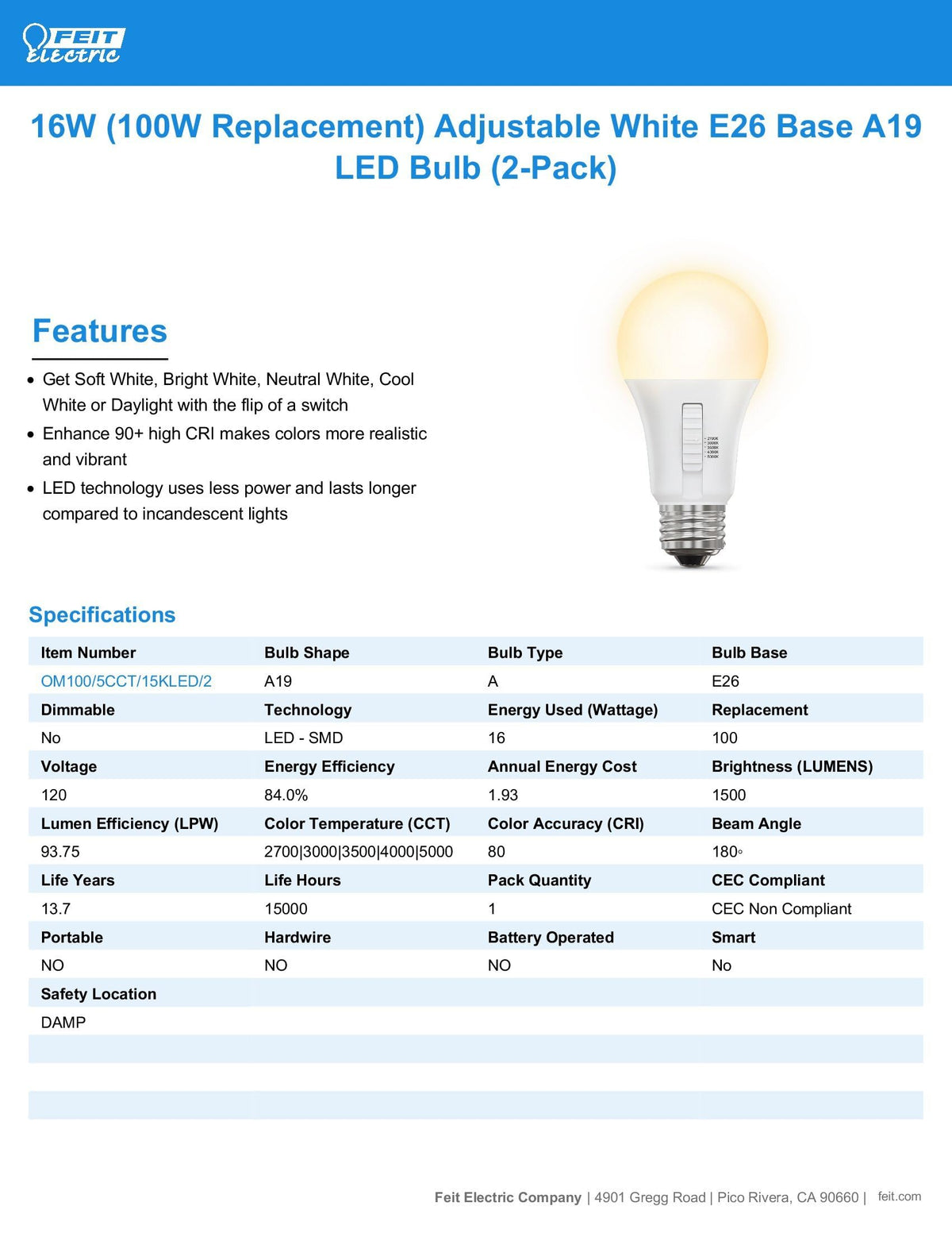 Get the right color light in any space with the Adjustable White 100-watt replacement A19 LED bulb from Feit Electric. Use the toggle on the bulb to select 2700K Soft White, 3000K Bright White, 3500K Neutral White, 4000K Cool White, or 5000K Daylight color temperatures. Set the mood during installation to match your existing lighting. Whether you want to energize your morning, focus on your tasks during the day, or wind down for the night, you can get the right energy-saving LED light in any room. No additional hardware or special apps are required. Selectable LED bulbs are rated to last 15,000 hours, for up to 13.7 years of dependable, even light.