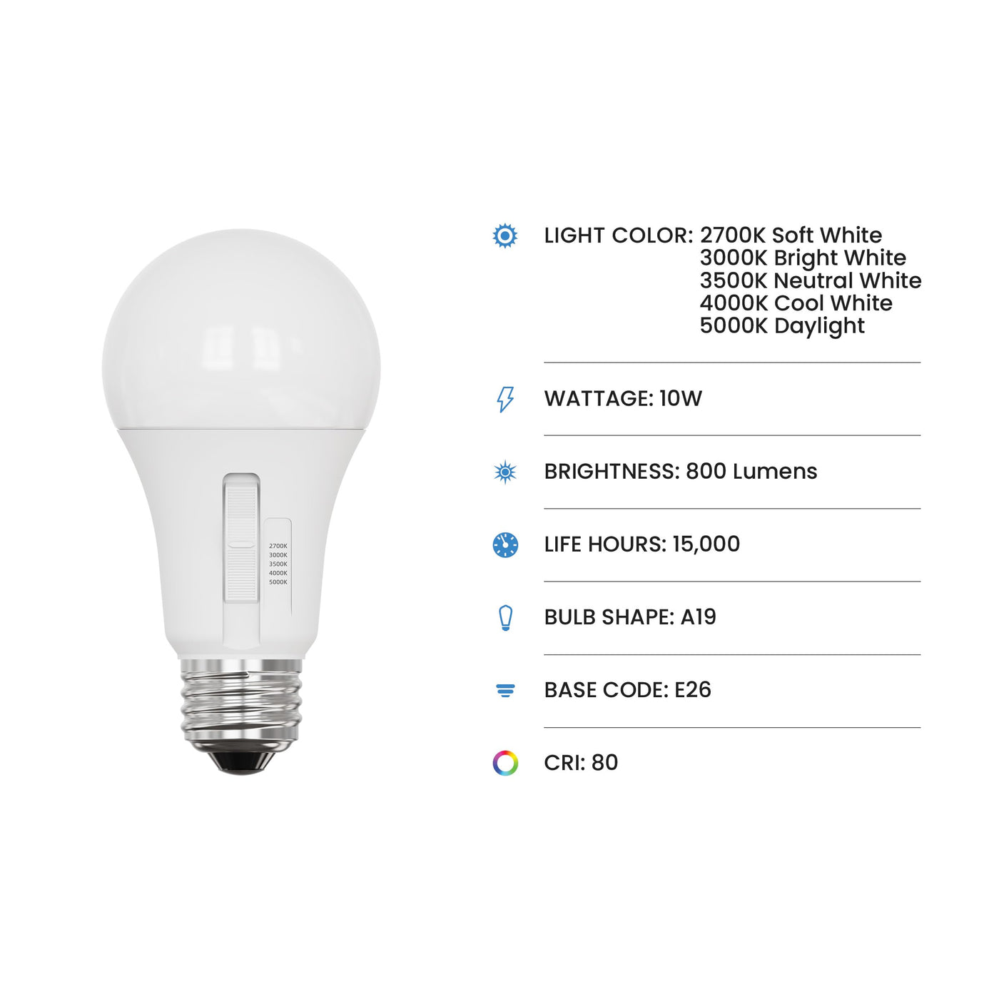 Feit Electric A19 Led Light Bulb, 60W Equiv, Non-Dimmable, Selectable Color Temperatures (2700K-5000K), 800 Lumens, General Purp