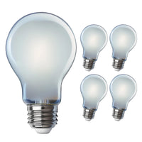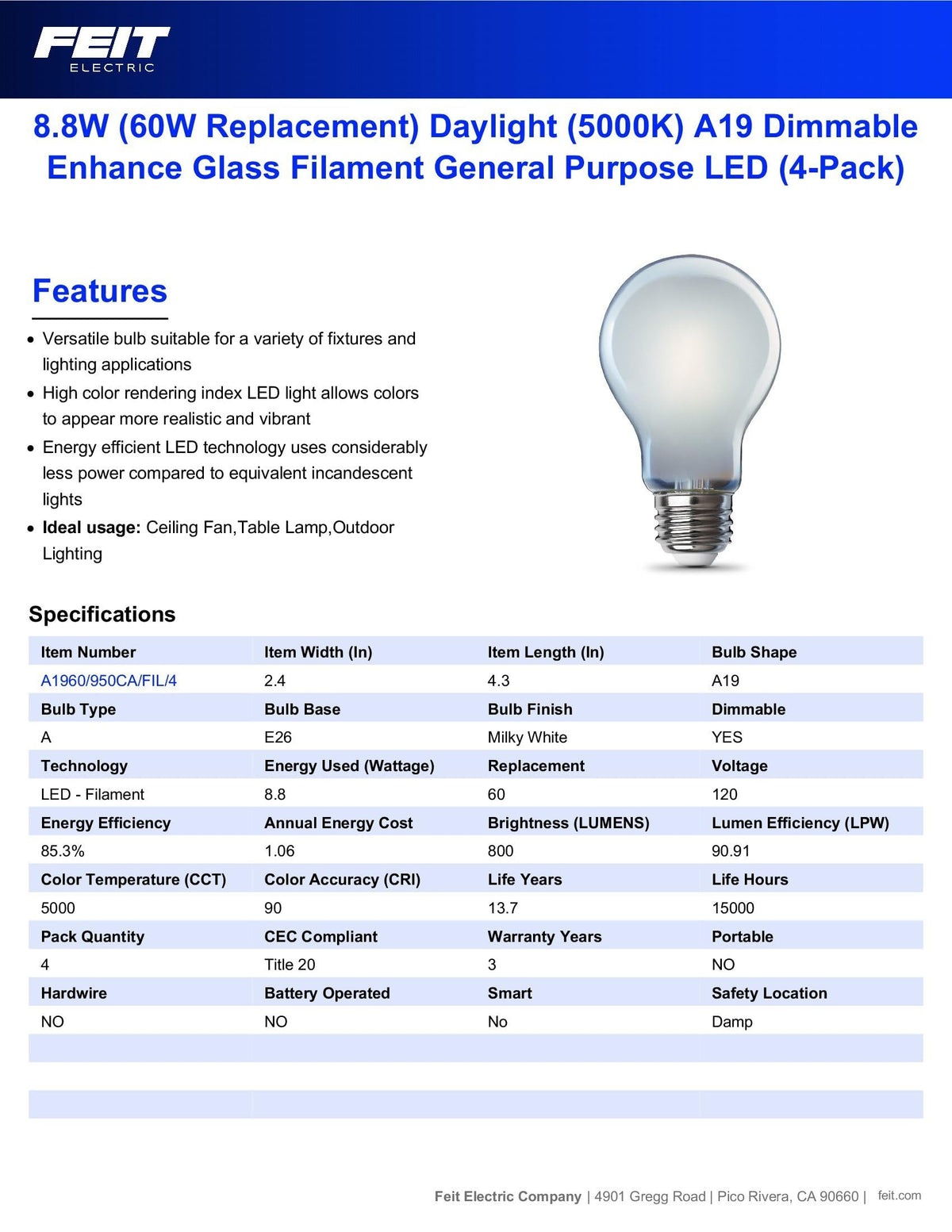 Enjoy all the benefits of advanced LED energy-saving technology with the Feit Electric A1960/950CA/FIL/4 4-Pack 60W Equivalent A19 Dimmable LED Light Bulbs. This 5000K Daylight bulb emits crisp, cool light ideal for task lighting and seeing fine details. It replaces 60-watt incandescent bulbs, producing a similar light output (800 lumens), and using only 8.8 watts of electricity - for 85.3% less energy use. Get instant on to full brightness with relatively cool running performance. Feit Electric LED A19 bulbs have an average life of 15,000 hours/13.7 years, are RoHS compliant, and are 100% mercury free. Choose a dependable, long-lasting decorative bulb for residential or commercial applications.