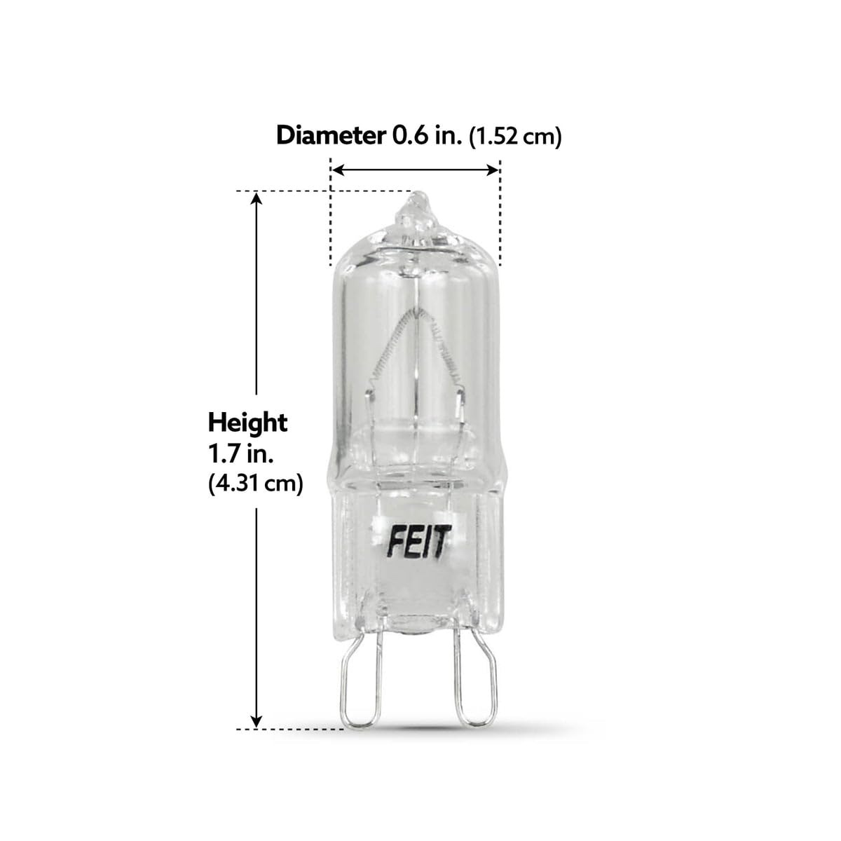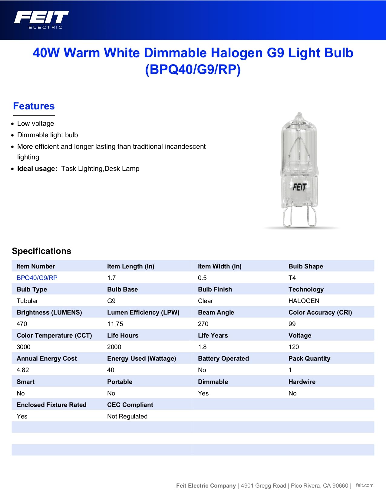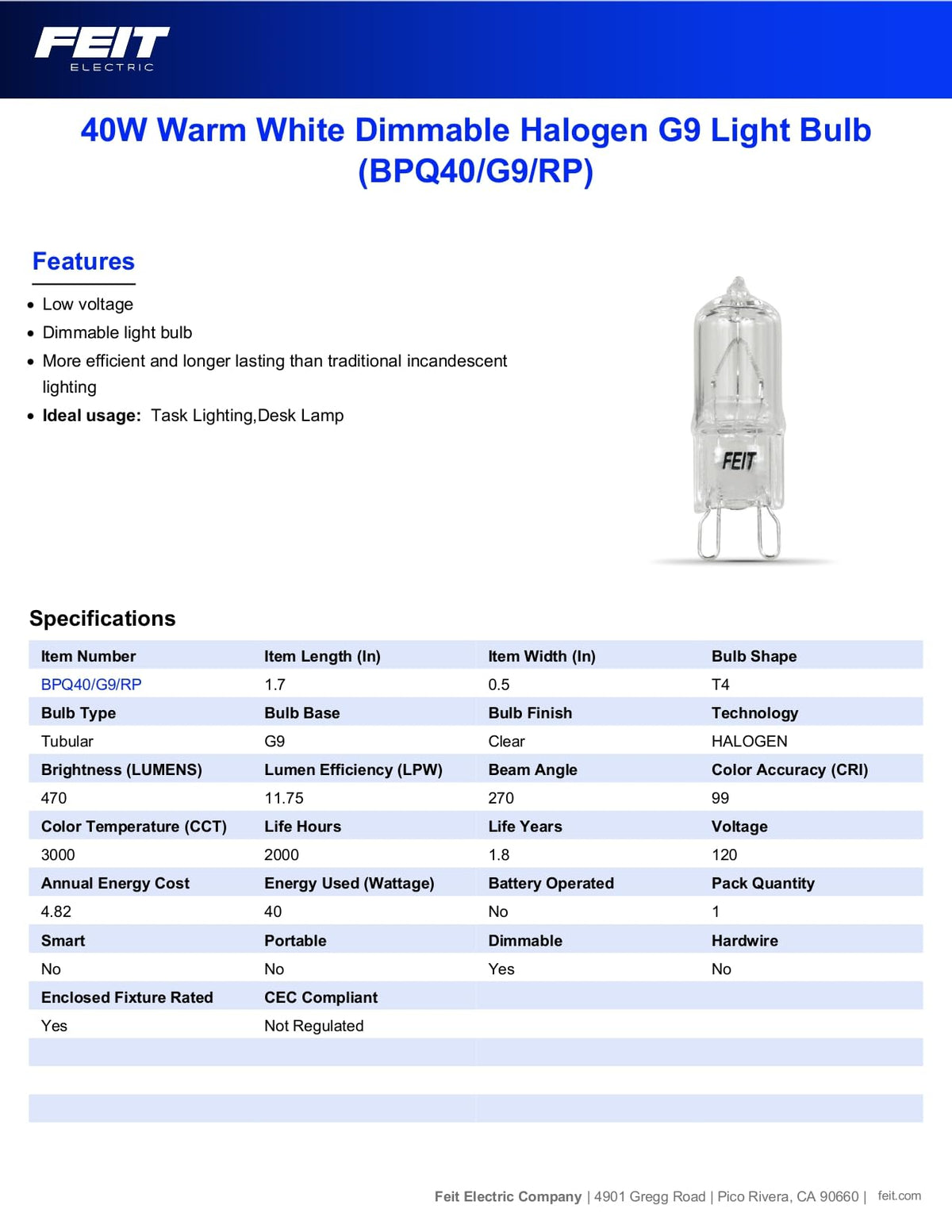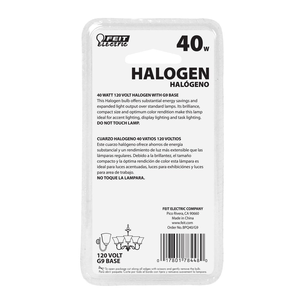 Product DescriptionFeit Electric BPQ40/G9/RP 40 watt Halogen JCD T4 with a G9 base Bi-Pin Bulb is manufactured with a clear, compact and dimmable construction ensuring superior performance. Efficient design offers upto 2000 life hours on a 120 volt line. Product measures 1-3/4 overall length and sold carded retail package. To us, lighting is everything. Feit Electric bulbs can turn a house into a home, make an unsafe area feel more secure, and navigating your way back to bed a lot easier. Feit Electric also manufactures energy-efficient LED luminaires including ultra-slim edge-lit ceiling fixtures, light-weight utility shop lights, and weatherproof outdoor LED fixtures. Family owned. Family operated. Based in Los Angeles, California since 1978. We are devoted to our long-time employees, customers, and retail partners - together, we all prosper. See more of our Feit family of products on our Store.From the Manufacturer40-Watt - halogen - compact and dimmable - use for desk lamps - G9 base - 2 pin - clear 120-Volt - 2000 hours life new pin base.