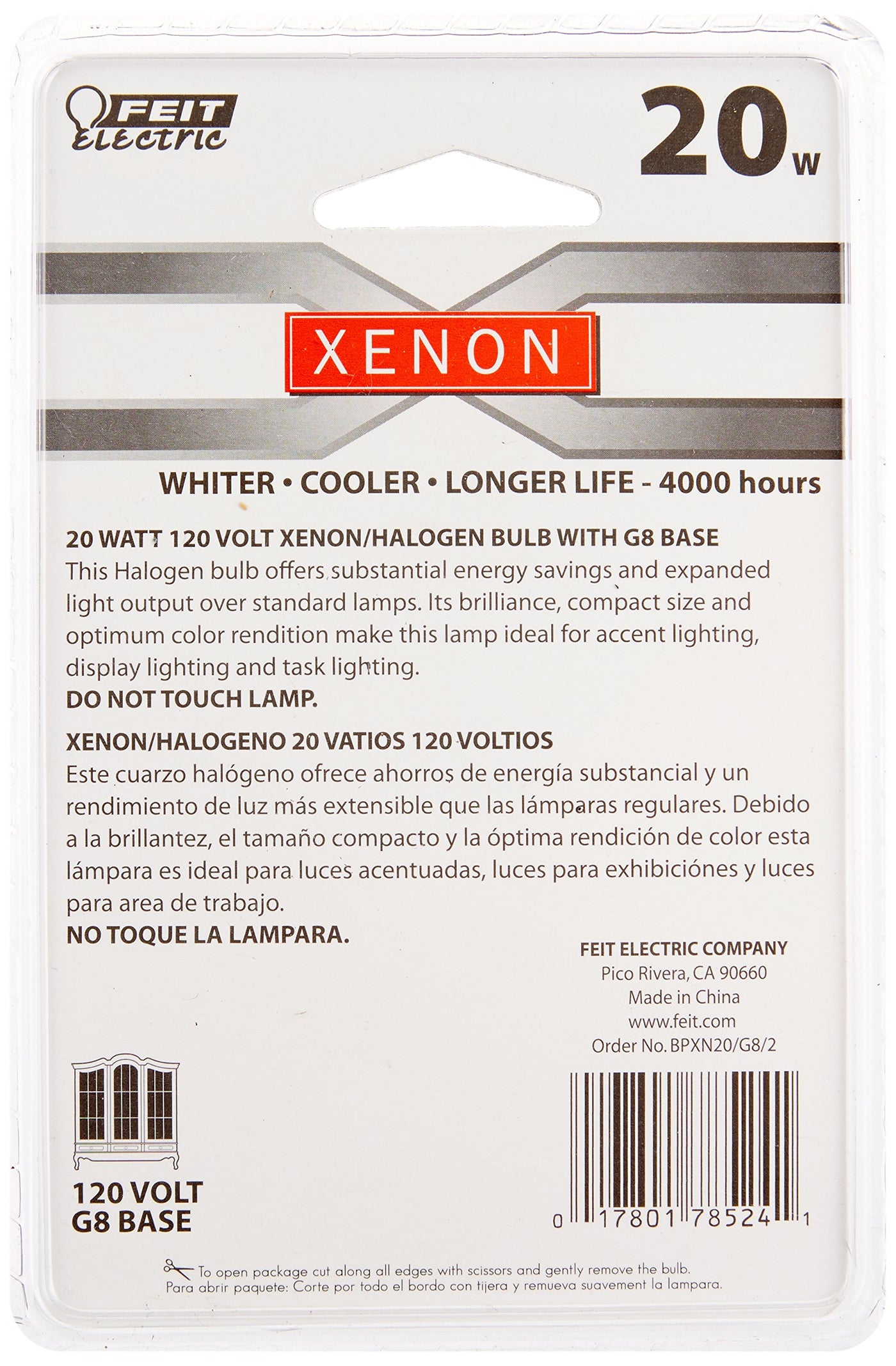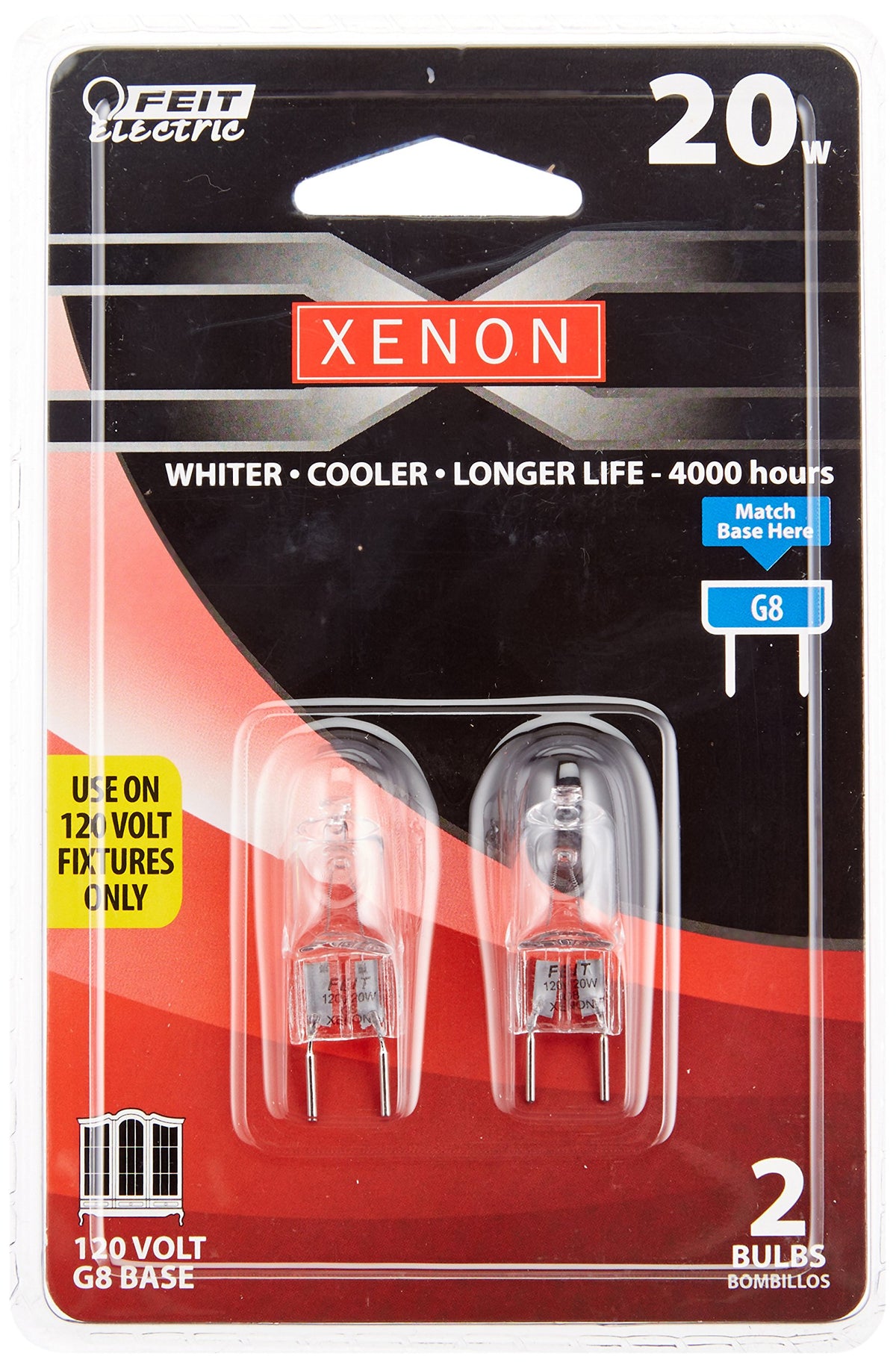 This 20-Watt Xenon G8 Base 2 pack produce a whiter, brighter light, run cooler and last longer than halogen bulbs. They provide light that is color accurate and make colors more vibrant and more realistic. Their brilliance, compact size and optimum color rendition make these lamps ideal for accent lighting, display lighting and task lighting.