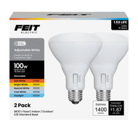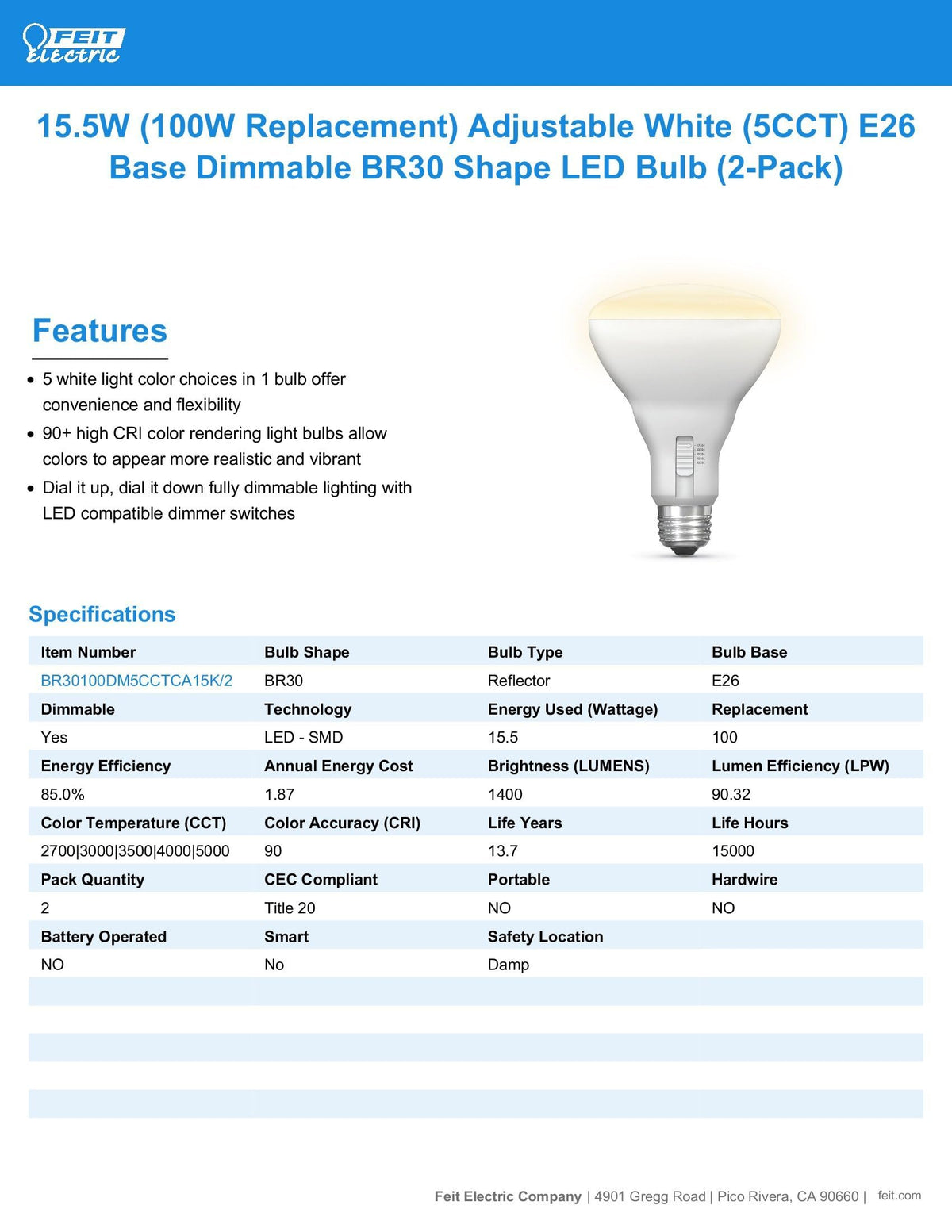 Enjoy all the benefits of advanced LED energy-saving technology with Feit Electric Adjustable White LED BR30 Light Bulbs. These dimmable 15.5-watt LED light bulbs produce a similar light output while using 84.5% less energy than a standard 100-watt incandescent bulb. Choose from Soft White, Bright White, Neutral White, Cool White, and Daylight color temperatures directly on the bulb or from a standard wall switch to get the perfect color temperature for any room and any mood. This high-performance bulb also has a high (CRI) of 90+ so colors appear more realistic and vibrant. Get instant on to full brightness with relatively cool running performance. These Feit Electric BR30 bulbs have an average life of 15,000 hours/13.7 years, are RoHS compliant, and are 100% mercury free. Choose a dependable energy-saving bulb for general-purpose, flood, or track lighting in residential or commercial applications. Suitable for damp locations.