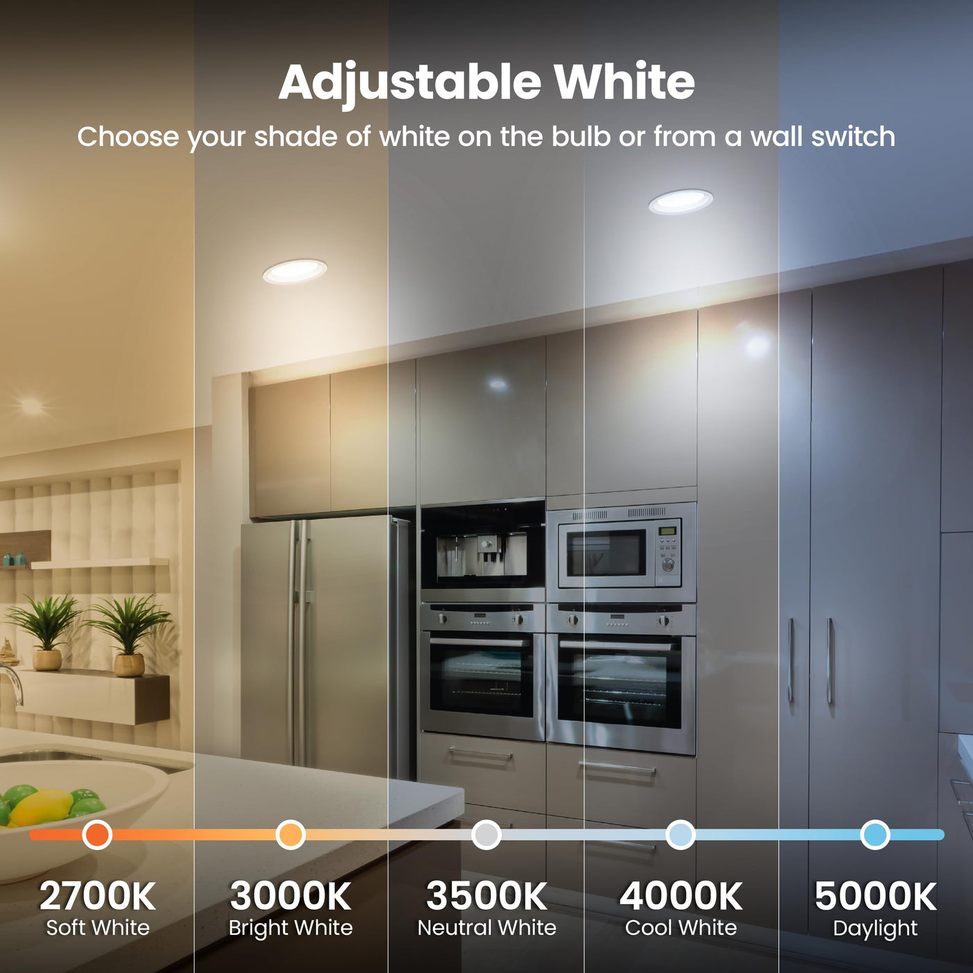 Enjoy all the benefits of advanced LED energy-saving technology with Feit Electric Adjustable White LED BR30 Light Bulbs. These dimmable 7.2-watt LED light bulbs produce a similar light output while using 88% less energy than a standard 65-watt incandescent bulb. Choose from Soft White, Bright White, Neutral White, Cool White, and Daylight color temperatures directly on the bulb or from a standard wall switch to get the perfect color temperature for any room and any mood. This high-performance bulb also has a high (CRI) of 90+ so colors appear more realistic and vibrant. Get instant on to full brightness with relatively cool running performance. These Feit Electric BR30 bulbs have an average life of 25,000 hours/22.8 years, are RoHS compliant, and are 100% mercury free. Choose a dependable energy-saving bulb for general-purpose, flood, or track lighting in residential or commercial applications. Suitable for damp locations.