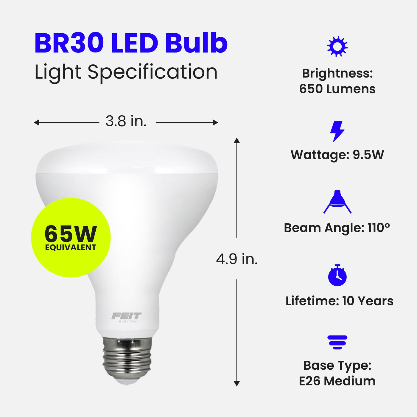 Feit Electric Br30/10Kled/3 Led Br30 Light Bulb Provides Up To 85.4% Energy Saving By Replacing 65W With 9.5W; Replace Your Old Incandescent Bulbs For A Brighter And More Energy-Friendly Space. Lasting 10 Times Longer Than Incandescent And Halogen Bulbs With A Lifespan Of Up To 10 Years, Eliminating The Need To Constantly Change Your Light Bulbs. With This 2700K Color Temperature It Is The Warmest Option That Most Closely Resembles A Standard Incandescent Blub; Giving A Warm And Cozy Feeling And Is Often Best For Kitchens, Laundry Rooms, Living Rooms, Dens And Bedrooms. No Warm-Up Time For These Bulbs; They Will Light Up Instantly With Its Full Brightness Of 800 Lumens With Stable Daylight Color. Ul Listed And Fcc Compliant, Feit Electric Upholds The Highest Standards For All Our Light Bulbs, Fixtures And String Lights With Optimal Performance And Safety; With 40+ Years Of Experience In Lighting, We Are The Leader In Lighting Innovations