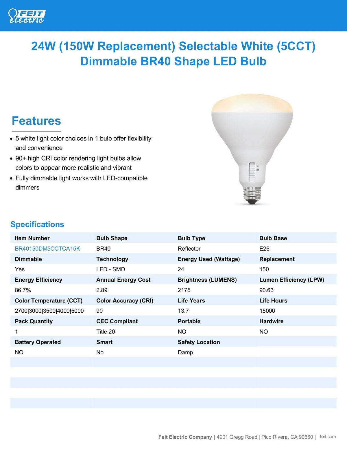 Enjoy all the benefits of advanced LED energy-saving technology with Feit Electric Adjustable White LED BR40 Light Bulbs. These 24-watt adjustable white BR40 dimmable LED light bulbs produce a similar light output while using 84% less energy than a standard 150-watt incandescent bulb. Choose from Soft White, Bright White, Neutral White, Cool White, and Daylight color temperatures directly on the bulb or from a standard wall switch to get the perfect color temperature for any room and any mood. This high-performance bulb also has a high (CRI) of 90+ so colors appear more realistic and vibrant. Get instant on to full brightness with relatively cool running performance. These Feit Electric BR40 bulbs have an average life of 15,000 hours/13.7 years, are RoHS compliant, and are 100% mercury free. Choose a dependable energy-saving bulb for general-purpose, flood, or track lighting in residential or commercial applications. Suitable for damp locations.