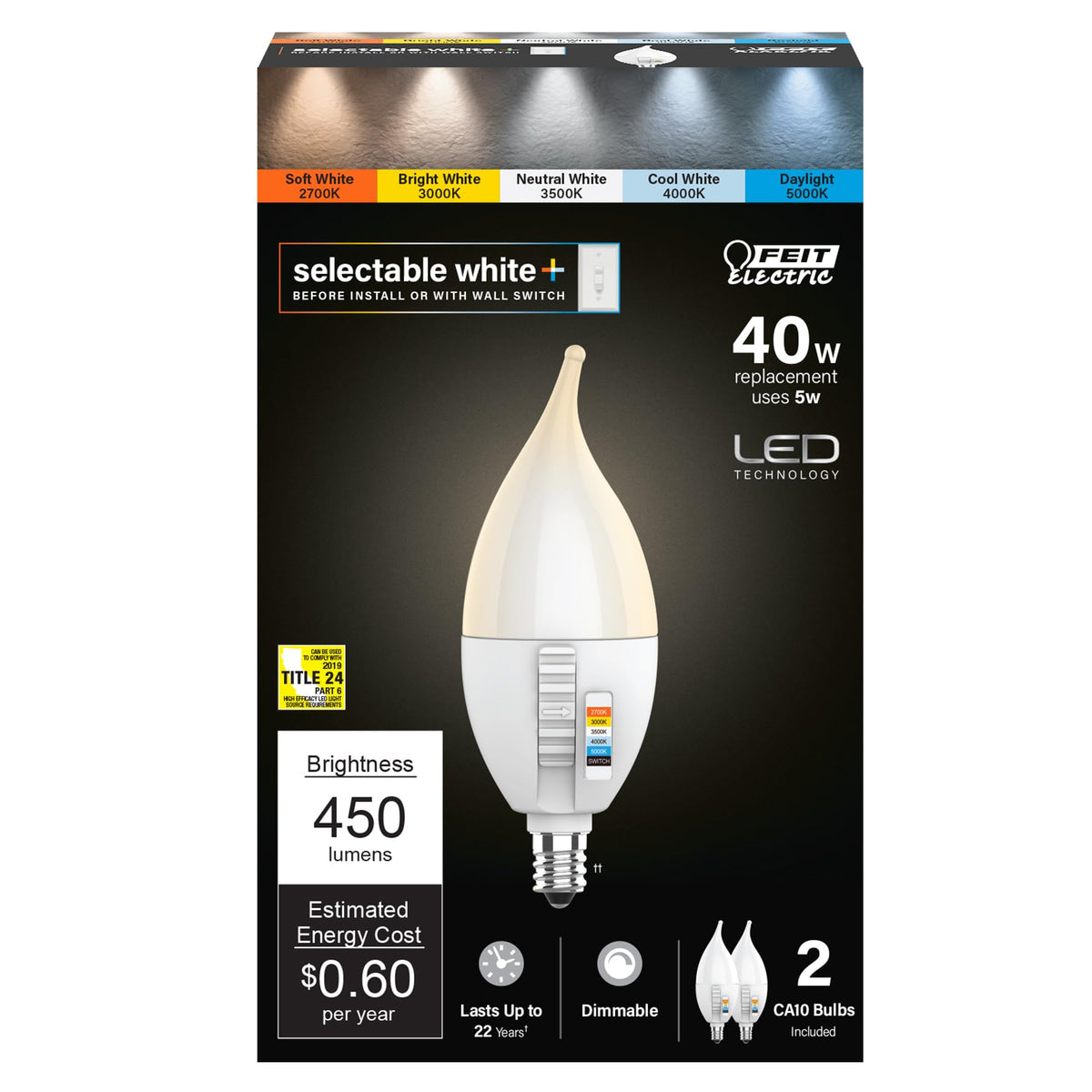 Enjoy All The Benefits Of Advanced Led Energy-Saving Technology With The Feit Electric Cff40/6Wyca/2 High-Cri Color Selectable Chandelier Led Light Bulb. Replacing A 40W Incandescent, This Candelabra Base Bulb Produces 450 Lumens Of Light While Using Only 5 Watts Of Electricity - Saving Up To 87% In Energy Costs. Preset Your Preferred Color Temperature On The Fixture Or Adjust After Install With A Toggle Of A Standard Wall Switch: Get Warm, Cool Or Daylight Color Light With Just A Flip. A Stylish Flame-Tip Design Instantly Livens Up The D Cor Of Any Room And A 90+ Cri Rating Makes Colors Vibrant And Skin Tones Look More Natural, All While Saving Energy And Lasting For Decades.