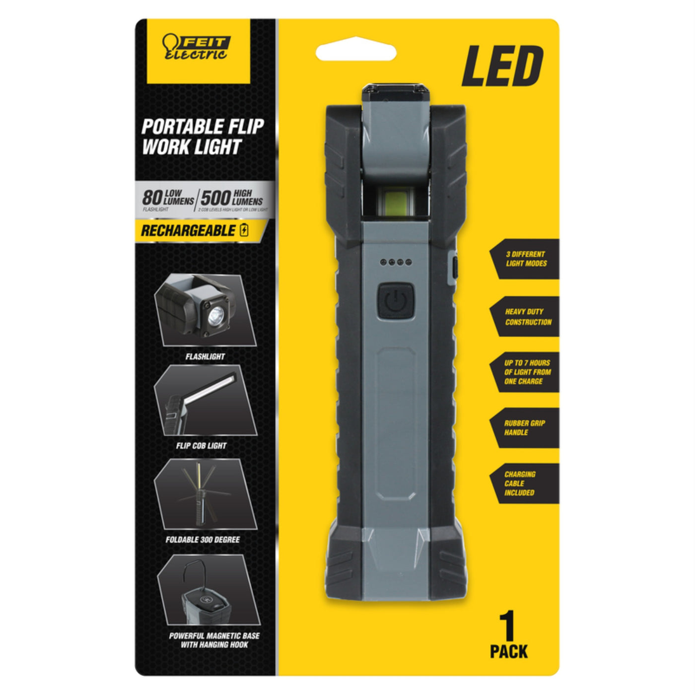 Light up the worksite with the Feit Electric WORK500BAT handheld Rechargeable LED work light flashlight. Durably constructed and long lasting, this dual use compact work light outputs 500/250 lumens of 6500K Daylight color temperature light. Flip the light to use as a flashlight on one end. The flashlight has an 80 lumens brightness. An attached hook and magnetic base allow the work light to be easily carried and stowed anywhere. A heavy-duty rechargeable lithium ion battery provides up to 7 hours of continual light. The mighty compact flashlight is heavy-duty constructed for extra durability this is a perfect accessory for jobsite, work site, camping, hiking trips, auto, safety, walking, emergency and more. Choose a Feit Electric work light for your portable lighting needs.