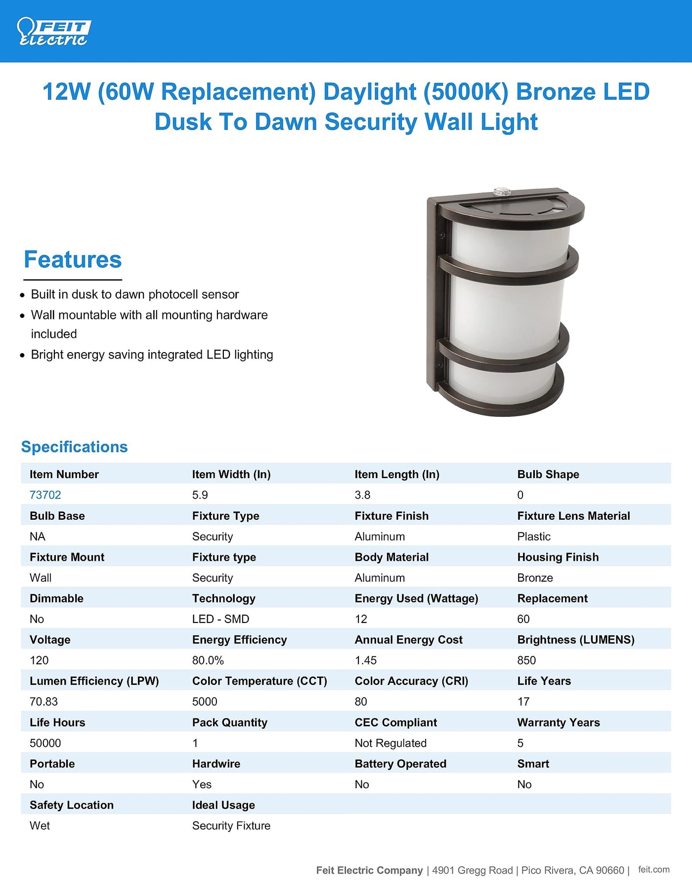 Q: What are the benefits of using the Feit Electric Dusk to Dawn LED Wall Light?A: The Feit Electric Dusk to Dawn LED Wall Light offers significant energy savings of up to 80% compared to traditional lighting, thanks to its advanced LED technology. It also features a built-in photocell sensor that automatically turns the light on at dusk and off at dawn, providing convenience and enhancing security around your home.