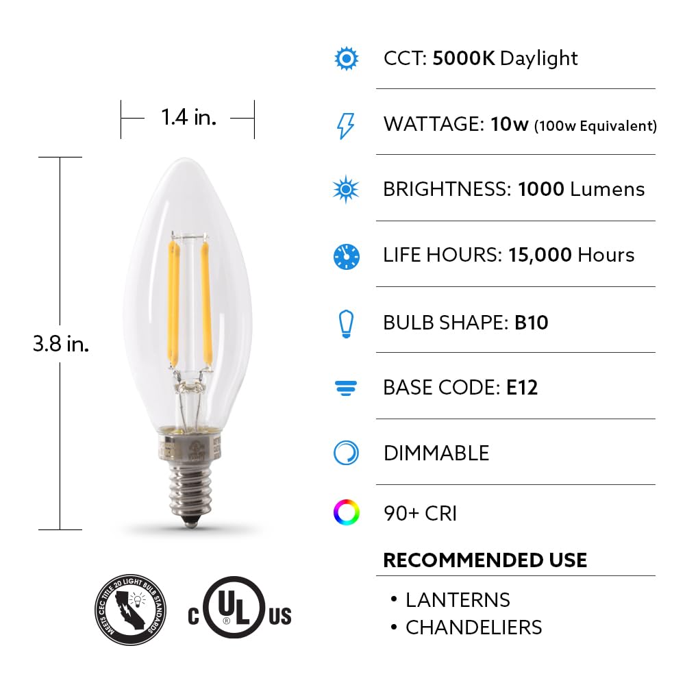 Feit Electric Led Candelabra Light Bulb, 100W Equivalent, Dimmable, E12 Base, 5000K Daylight, B10 Filament Torpedo Tip Decorativ