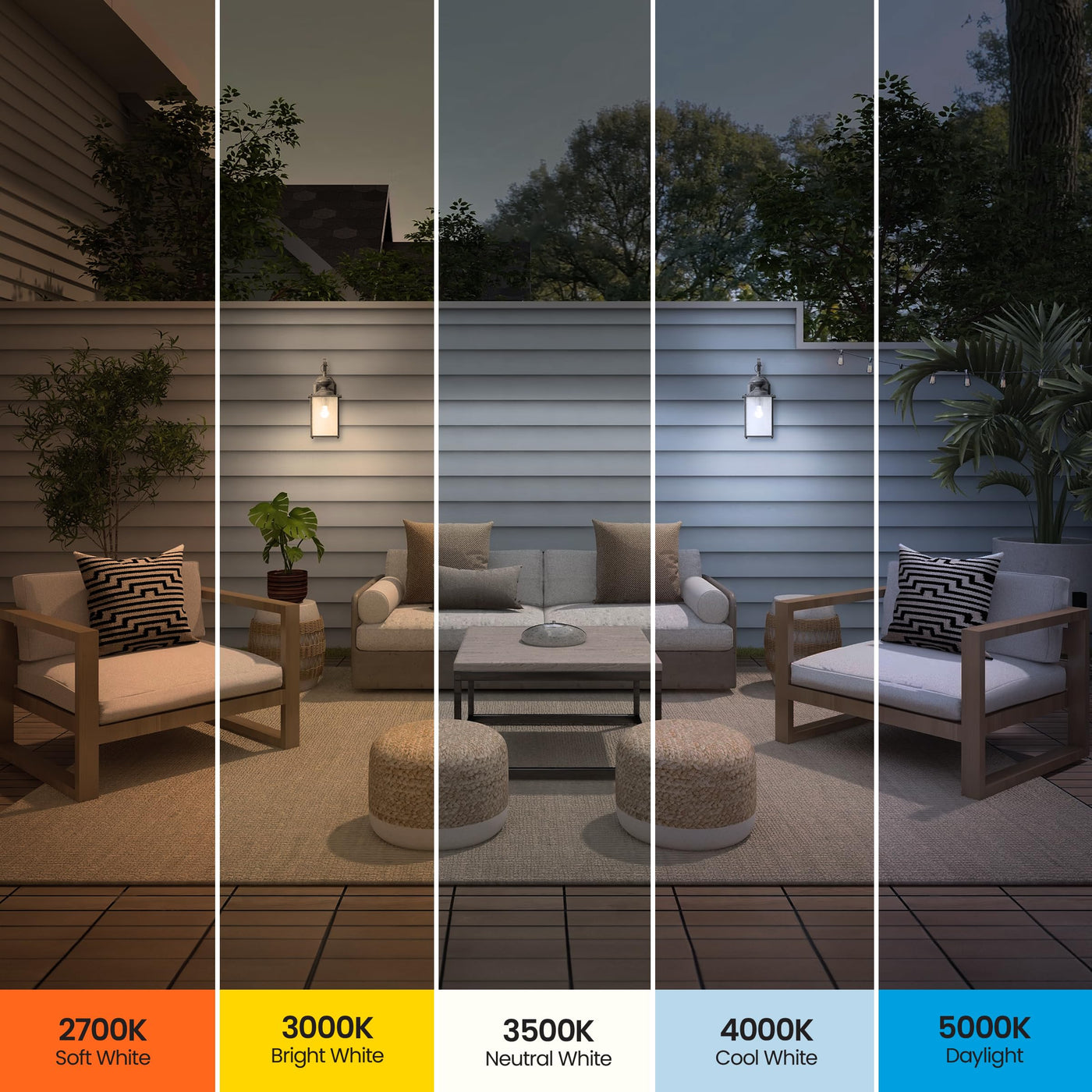 Get a convenient outdoor light that turns on automatically at night with the OM100/5CCTCA/DD/LEDI Adjustable White Light Bulb from Feit Electric. This 100-watt equivalent LED bulb features an integrated dusk-to-dawn sensor that detects sunlight. It turns on when the sun goes down and off during the day, hassle-free lighting for your outdoor space. Install it on patios or in other outdoor fixtures with access to sunlight and never worry about turning on the lights at night. Not sure which color to choose? A toggle on the bulb lets you select the perfect color temperature for your space. Select 2700K Soft White, 3000K Bright White, 3500K Neutral White, 4000K Cool White, or 5000K Daylight. Whether you want cool light for added security or warm light for relaxing outdoors, you can get the right LED light in any space. No additional hardware or special apps are required. Upgrade your outdoor areas to Adjustable White Dusk to Dawn LED Bulbs to experience the convenience of having the perfect shade of light every time and the added benefit of energy savings for years to come.