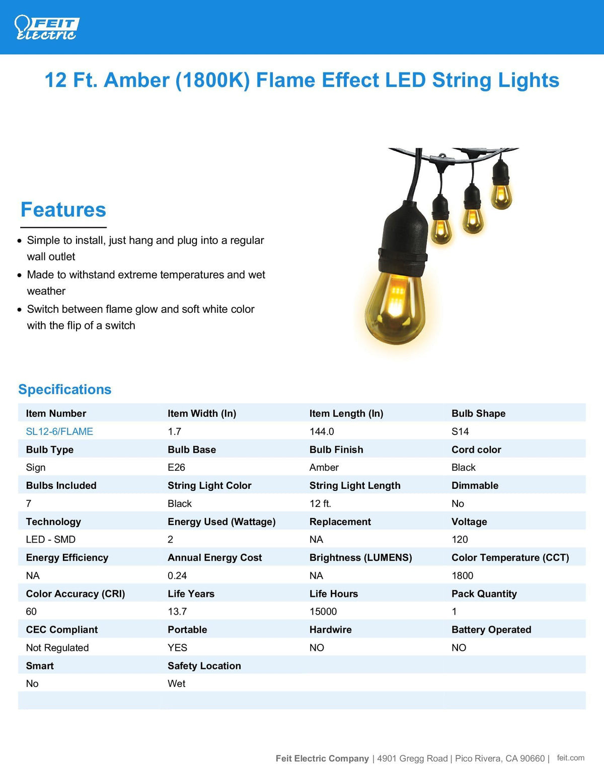 Enhance Your Outdoor D?Or With The Magical Glow Of Sl12-6/Flame Flame Effect Led String Lights From Feit Electric. Six Shatter-Proof Amber Bulbs Imitate A Flame Effect Or Glow Soft White With The Flip Of A Wall Switch. Dual Lighting Mode Allows A Choice Of Either Soft White Color Temperature Or A Flame Effect, With Just A Flip Of A Switch. Ip65 Rated And Engineered With Heavy-Duty Materials, These String Lights Are Able To Withstand Extreme Temperatures And Weather For Year-Round Enjoyment. Installation Is Easy, And Up To 36 Sets Connect End-To-End Safely So You Can Easily Illuminate A Variety Of Outdoor Spaces.