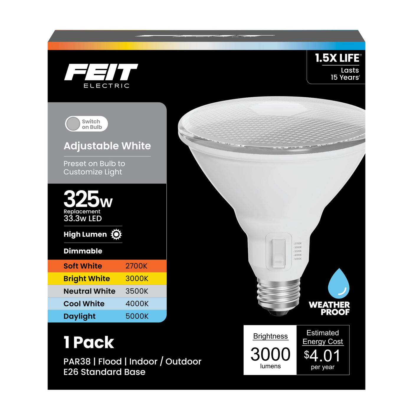 Accent an area in your home or add outdoor security with the PAR38325DM5CCT Adjustable White reflector light bulb from Feit Electric. Ideal for spot lighting, this dimmable bulb puts out 3000 lumens using up to 88% less energy than an equivalent 325-watt incandescent light bulb. Choose from five white color temperatures in one versatile bulb. Select from Soft White, Bright White, Neutral White, Cool White, or Daylight on the bulb before installation to match your current lighting or set the perfect color temperature for your space. Feit Electric PAR38 LED bulbs are wet location rated for use indoors as well as in outdoor fixtures. Choose a dependable Feit Electric reflector bulb for recessed and outdoor security lighting applications.