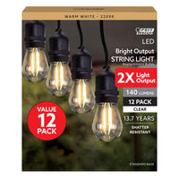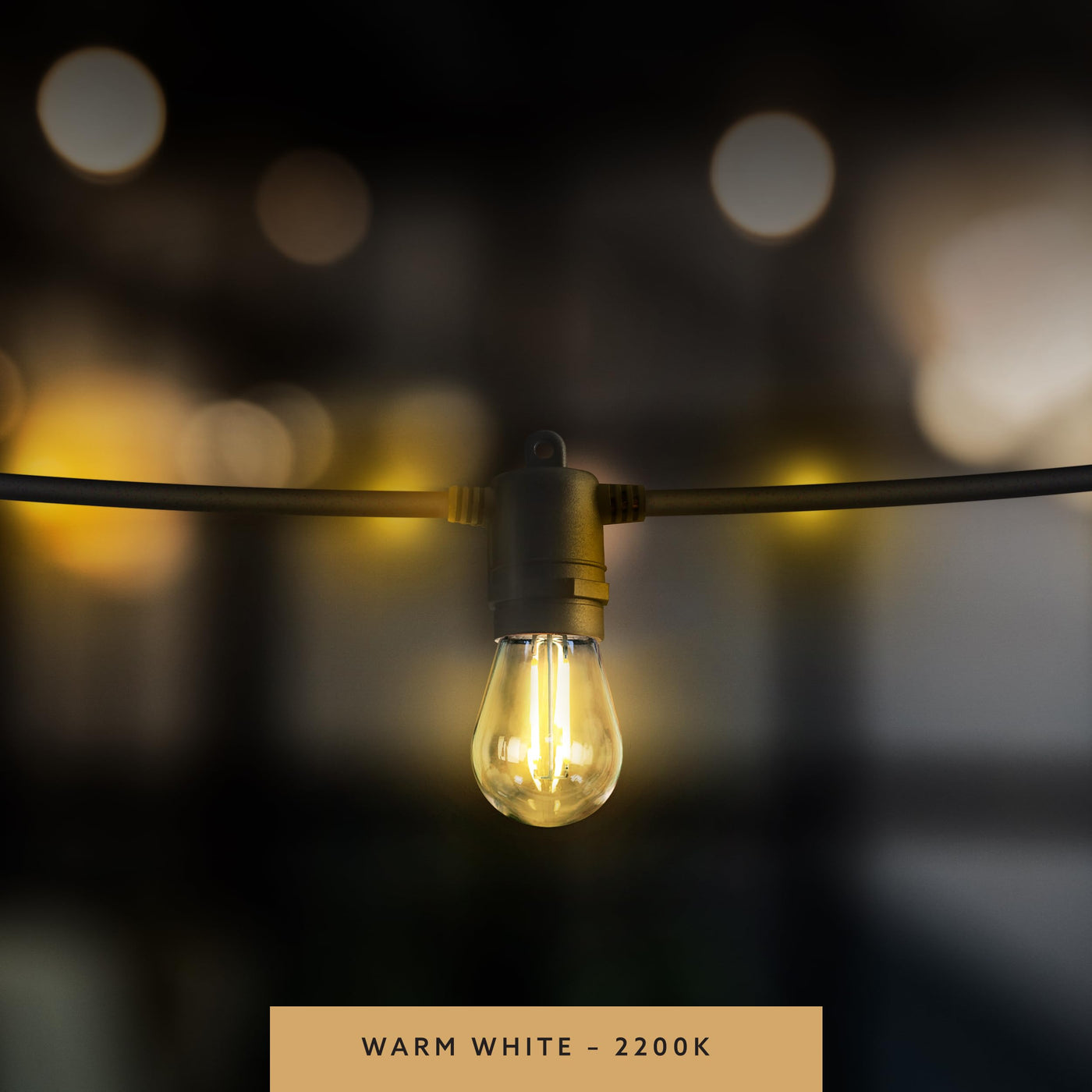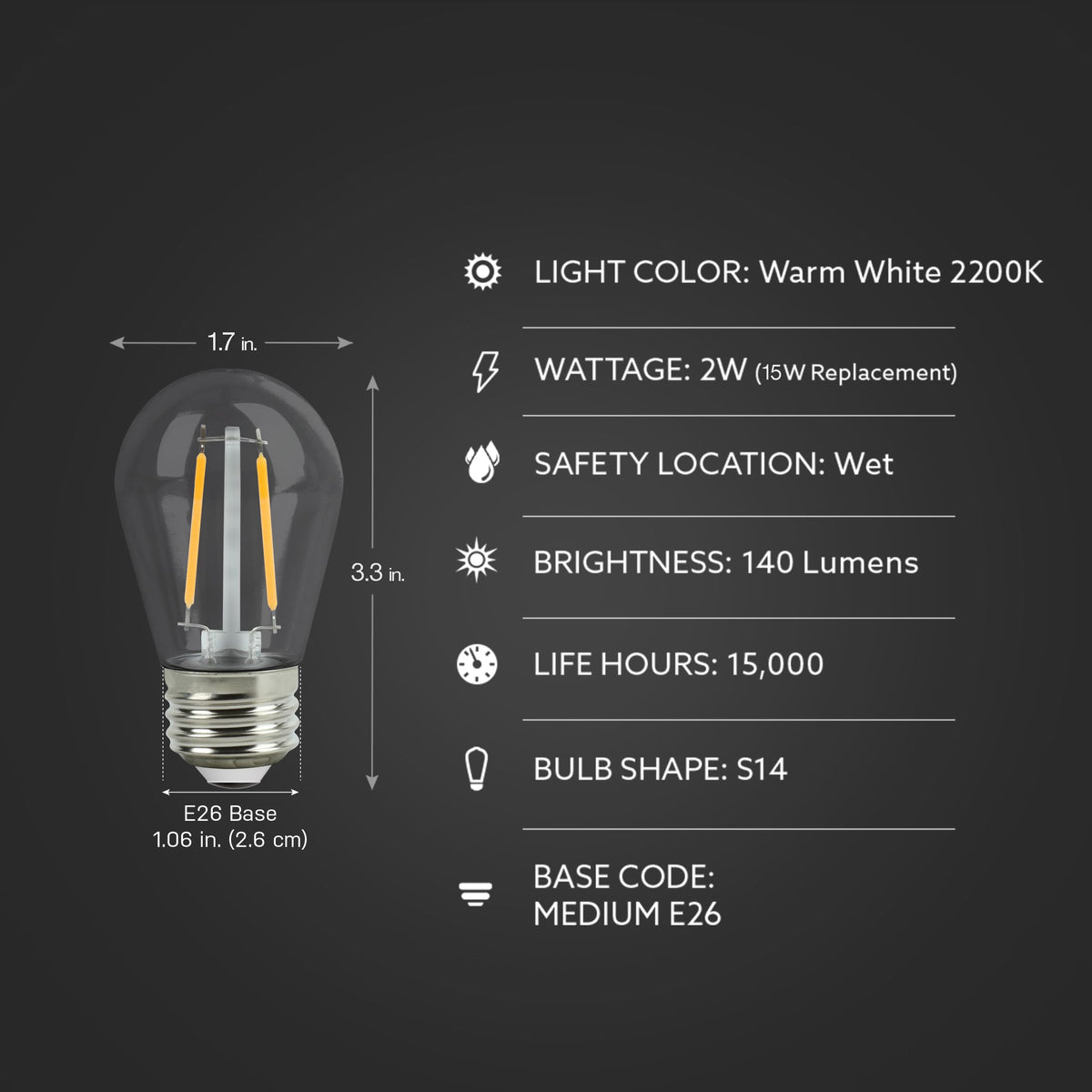 Combine classic style with modern reliability and energy savings with Feit Electric S14HO/822/FIL/12 High Output Filament String Light Replacement Bulbs. Each LED Bulb is made with an exposed filament and wrapped in a durable clear housing to deliver a new twist on a classic look and feel. Upgrade your old string lights to these S14 bulbs for a non-dimmable 2200K Warm White glow and ultrabright 140-lumen output. These bulbs use 2 watts per bulb, using up to 81% less energy than traditional 11-watt incandescent bulbs while emitting extra illumination. They have an estimated annual energy cost of only $0.24/year per bulb (based on 3 hours per day of use). Get up to 15,000 hours/13.7 years of life. Get instant on to full brightness with relatively cool running performance when compared with incandescent bulbs. Choose Feit Electric S14 filament bulbs to add a touch of class to your porch, patio, or outdoor space for years to come.