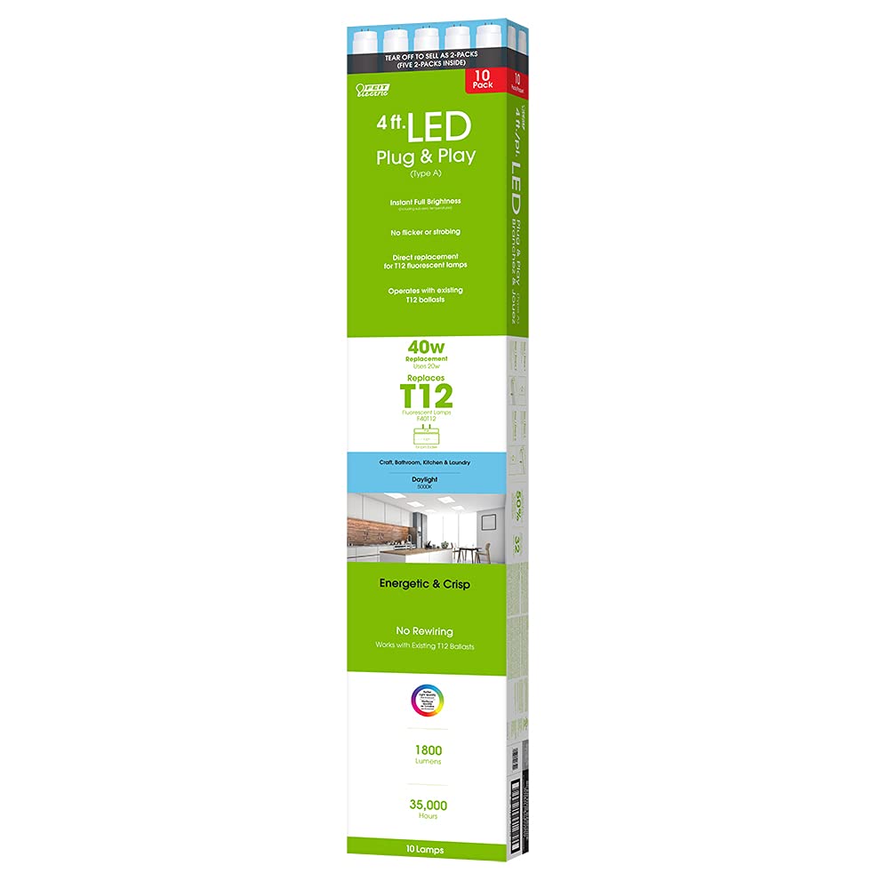 This 10-Pack Of Feit Electric 4 Foot Linear Led Bulbs Makes It Easy To Convert Your Existing Fluorescent Fixture To Led Technology. The Plug And Play Simplicity Of This Led Bulb Allows A Direct Replacement For T12 Fluorescent Bulb, With No Rewiring Of Your Fixture. The Led Bulb Has A Life Expectancy Of Up To 35,000 Hours And Can Operate In Existing Fluorescent Fixtures That Have A 2-Pin G13 Connector. It Produces A Similar Fluorescent Lamp Output Of 1800 Lumens, Using 18W Of Electricity Up To 50% Less Energy Than A Standard Fluorescent Lamp. This 5000K Daylight Light Is Non-Dimmable And Eliminates The Flicker And Humming Associated With Normal Fluorescent Lamps. This Bulb Has A Shatter Resistant Coating And Is Rohs Compliant And 100% Mercury Free. Specifications: ?? Colors Temperature: 5000K ?? Brightness: 1800 Lumens ?? Watt Equivalent: 40 Watts ?? Watt: 20 Watts ?? Dimmable: No ?? Ul-Listed: Yes ?? Life Hours: 35000.