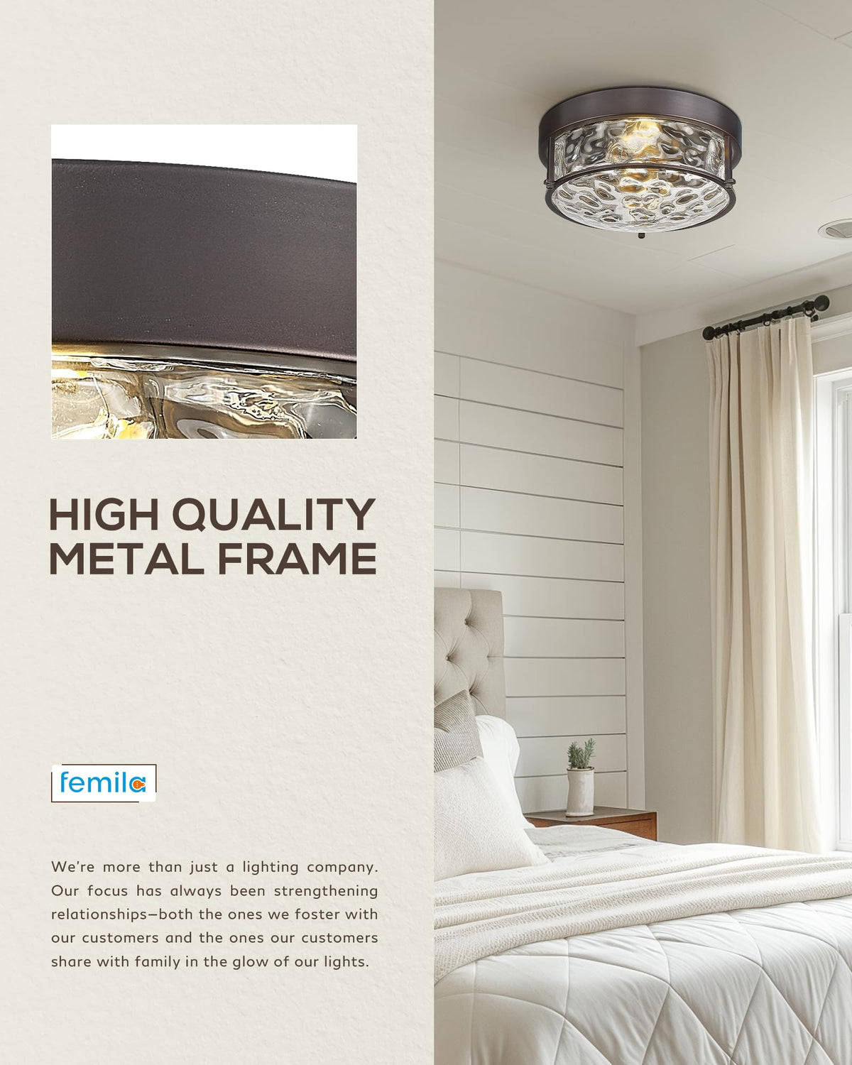 Q: What styles does the FEMILA ceiling light complement?A: The modern design of the FEMILA ceiling light, along with its elegant water ripple glass, complements a variety of styles, including contemporary, vintage, and farmhouse aesthetics.