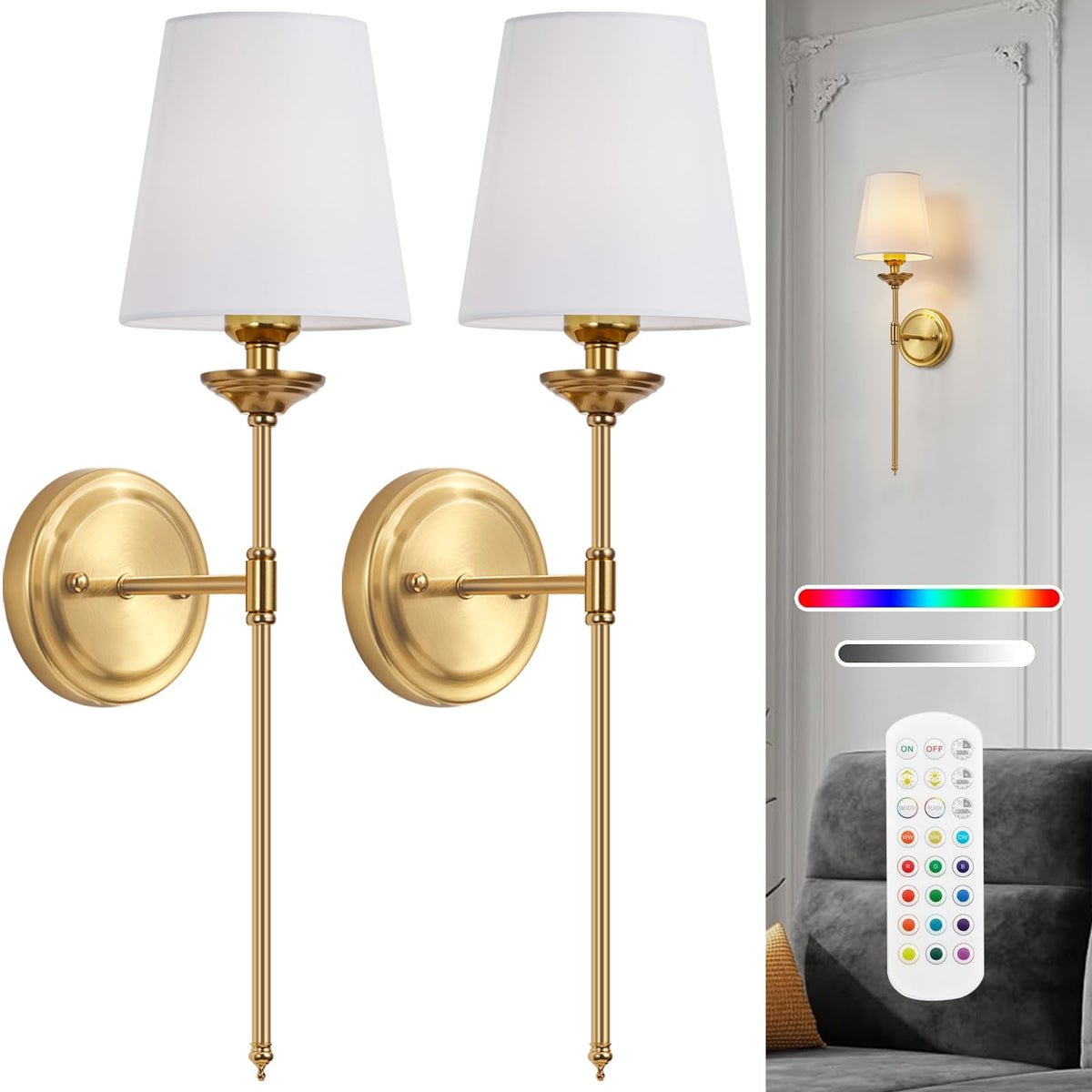 Femusytt Battery Operated Wall Sconces Set Of 2, Rechargeable Cordless Wall Light With Remote And Fabric Shade, 10 Colors Modes