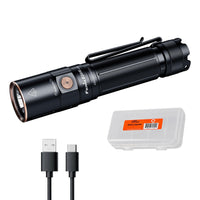 Q: What is included in the package when I purchase the Fenix E28R V2.0 flashlight?A: When you purchase the Fenix E28R V2.0 flashlight, the package includes the flashlight itself with an ARB-L18-3400 battery pre-installed, a USB-C charging cable, a lanyard for easy carrying, and an organizer for storage.