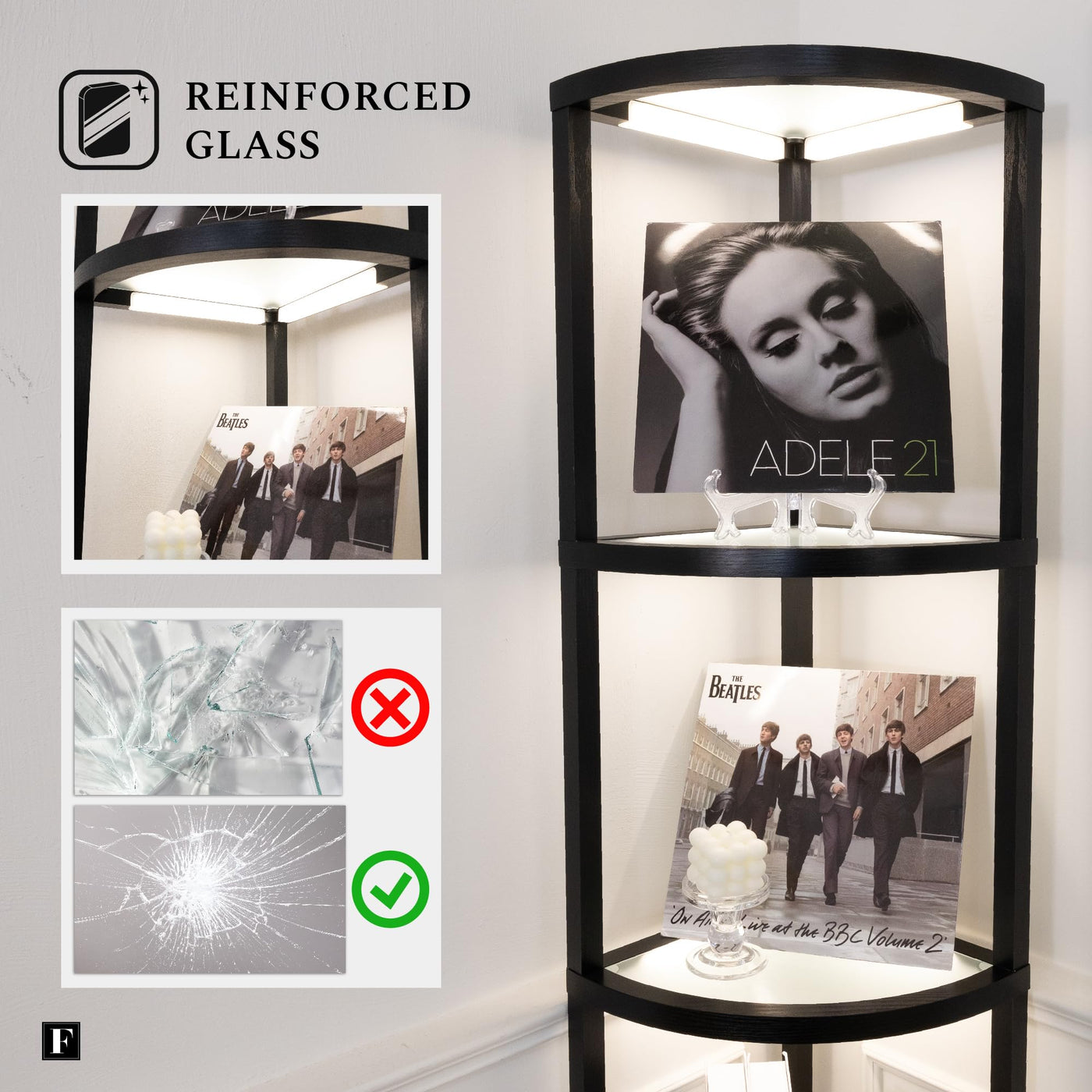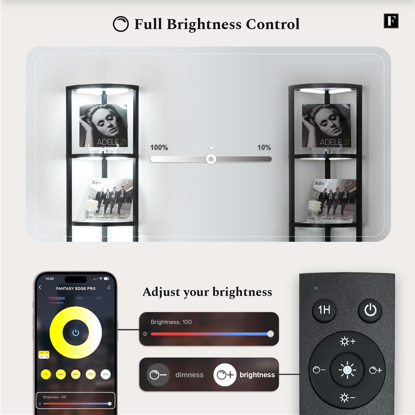 Introducing Our Fantasy Edge Pro Corner Floor Lamp With Built-In Shelves And Glass Display Cabinet, Designed To Elevate Your Display Experience While Maximizing Space Efficiency. With A Color Range Of 2700K To 6000K, Seamlessly Transition Between Warm And Cool-Toned Lighting To Complement Any Mood Or Space, Creating A Dynamic And Personalized Ambiance For Your Items. Effortlessly Control Your Display With Our Remote And App Control Features. Synchronize Your Model With Our Dedicated App Or Use The Included Remote To Turn Your Lamp On/Off, Adjust The Color Temperature, And Unlock Presets With Ease. Immerse Yourself In A Tailored Led Display Experience Like Never Before. Built With Strength In Mind, Our Tempered Corner Glass Shelves Support And Showcase Your Most Cherished Items. Each Corner Tier Can Accommodate Up To 60 Lbs, Making It An Ideal Glass Curio Cabinet For Collectors. Sized At 11.6'' X 16.3'' X 66.4'', Fantasy Offers Ample Space For Showcasing Your Treasures, Making It A Collector'S Dream Display Stand. Unlike Other Shelf Floor Lamps, Fantasy Edge Pro Features An Advanced Uv Coating, Making It Pet And Child-Friendly. Say Goodbye To Harsh Smells And Airborne Toxins, And Light Up Your Rooms Confidently Without Worry. Enjoy A Hassle-Free Setup With Our Easy Assembly Process. Follow The Step-By-Step Instruction Manual Or Check Out Our Instructional Videos For The Best Assembly Experience. Elevate Your Home'S Style And Functionality With Fantasy Corner Floor Lamp With Built-In Shelves And Glass Display Cabinet - The Perfect Solution For Displaying What Matters Most.