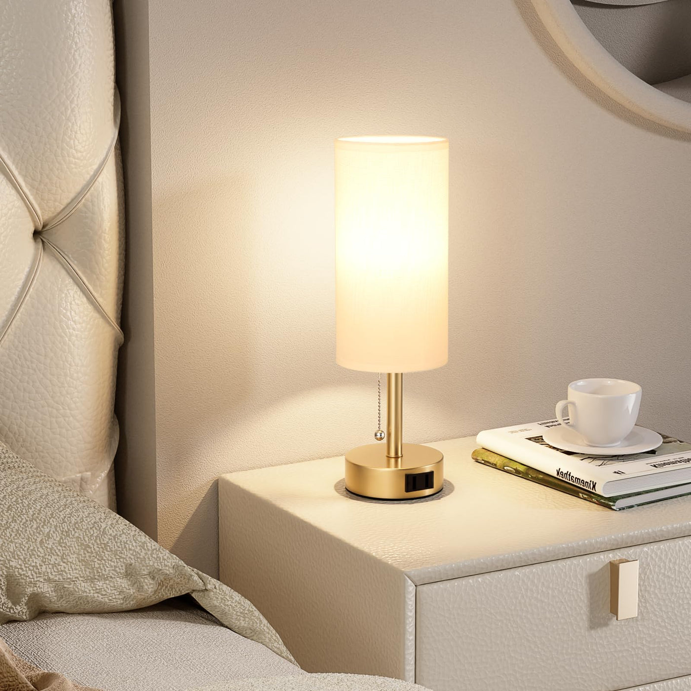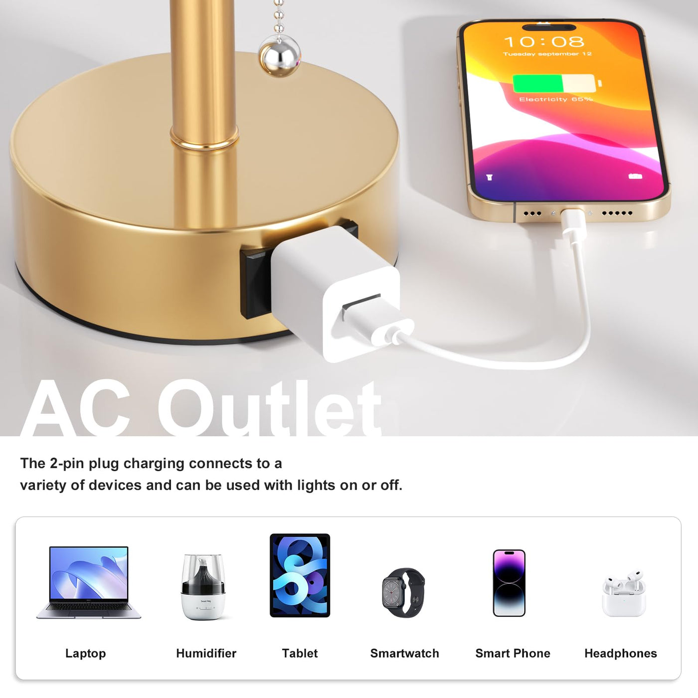 Fenmzee Gold Bedside Table Lamps Set Of 2-3 Color Temperatures Pull Chain Lamp With Ac Outlet Charging Port, Two Round Night Sta
