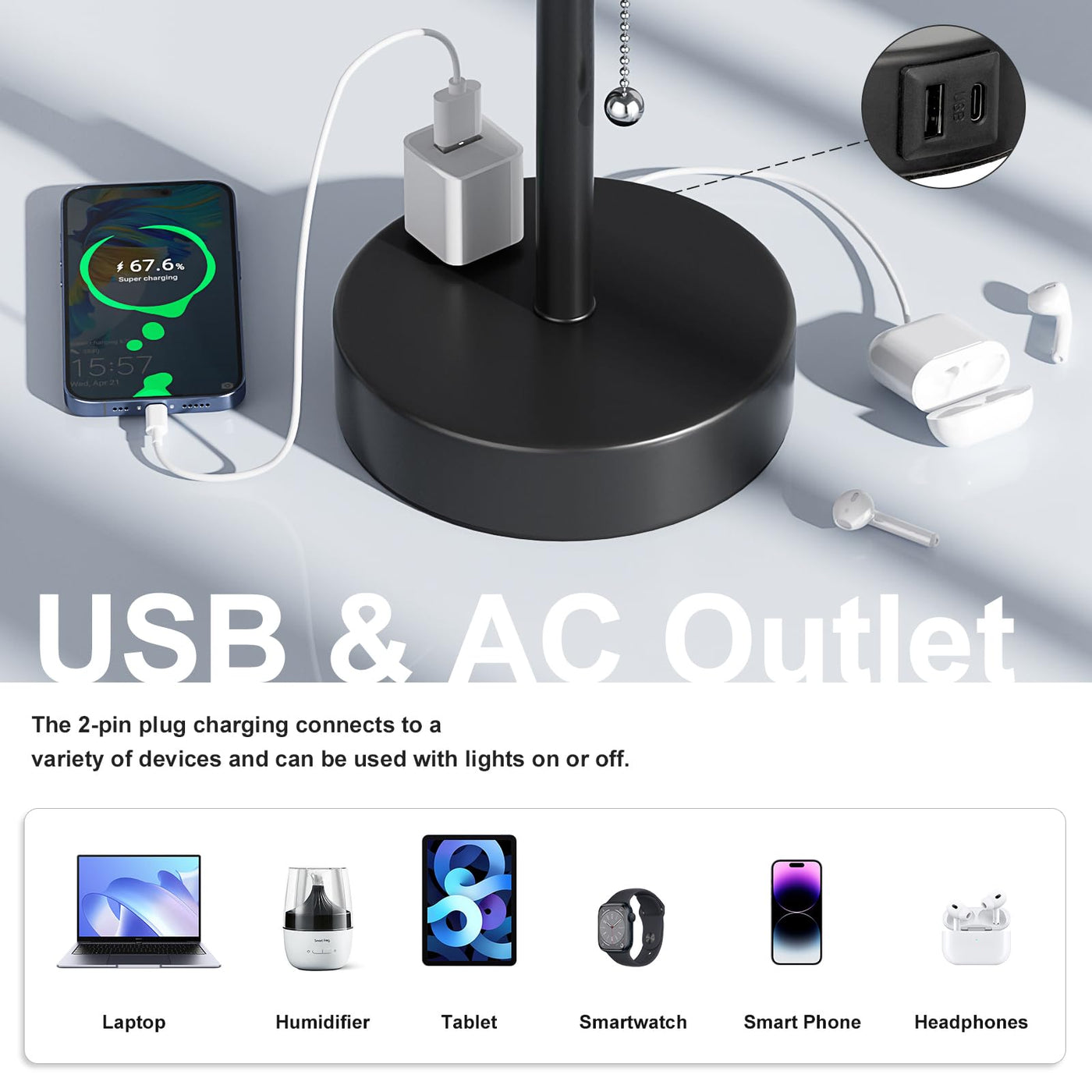 Q: Does the lamp have an AC outlet for charging devices?A: Yes, the lamp features a practical AC outlet that allows you to charge devices such as smartphones, tablets, and laptops directly from the lamp, eliminating the need for additional power outlets and keeping your workspace organized.