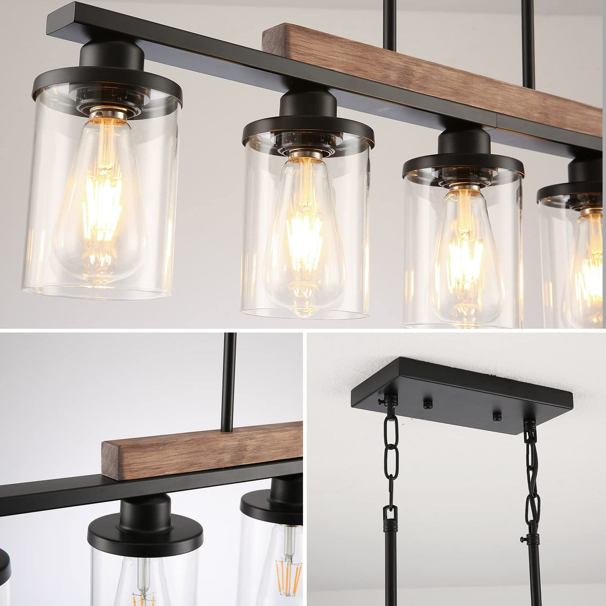 Feohak Dining Room Light Fixture,5-Light Kitchen Island Lighting Farmhouse Chandelier,Matte Black Metal Wood Industrial Pendant