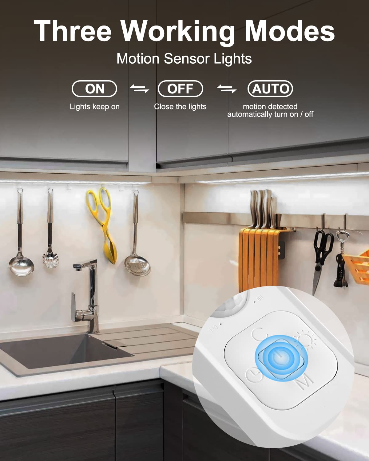 Q: What are the different working modes of this motion sensor light strip?A: The motion sensor light strip has three working modes: Auto Mode (turns on with motion), Always-On Mode (constant lighting), and Off Mode. You can switch between these modes based on your preference or need.