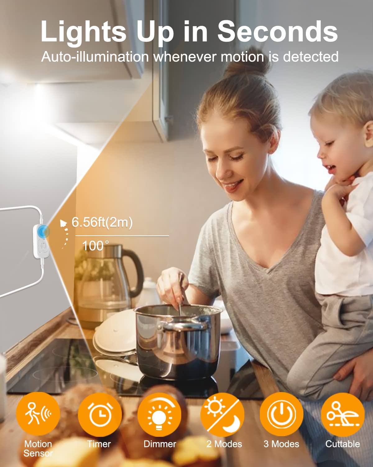 - **Sensitive Motion Sensor**: Equipped with passive infrared technology (PIR), this light strip automatically turns on in the dark when it detects human motion within 10 feet, providing hands-free convenience exactly when you need it.