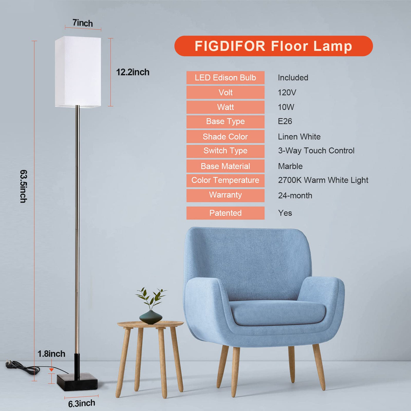 Figdifor Floor Lamp, 3-Way Touch Control Dimmable Standing Lamp With Sturdy Marble Base, Brushed Nickel Touch Floor Lamp Tall La