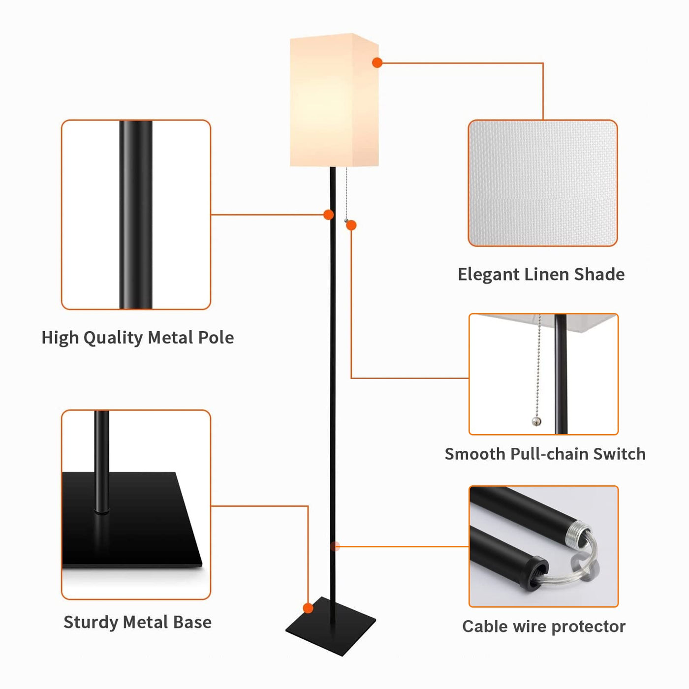 Do you want to have such minimalism and classic floor lamp At night, it can be used as readingworking floor l At day, it is decorative standing lamp. Just choose us that let us to meet your expectations Our stand up light lamp can be fits any home decoration. A long enough power cord allows you to use it far away from the socket(70.9inch), which is very convenient. And with the heavy metal base that provide a good stability, keeps safety for your baby and pets Furthermore, the save space design support you place the tall standing lamp anywhere as your desire, you may use it as a bedside reading light, living room couch lamp, floor reading lamp or offices standing lamp Package Included: 1 x Floor Lamp 1 x Lamp Shade 1 x 6W LED Bulb Features: Material: Metal + linen Power source: corded-electric Floor Lamp Height: 64.6inch Electric cord Length:70.9inch Shade color: Linen White Switch Type: Pull chain Dimmable: No Max Watts: 60w Warm Tips: The floor lamp and the bulb are not waterproof.