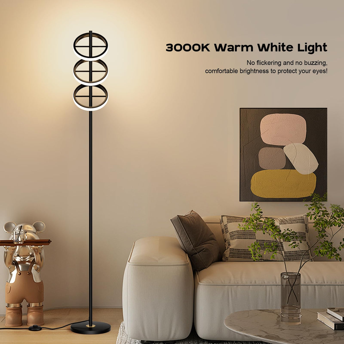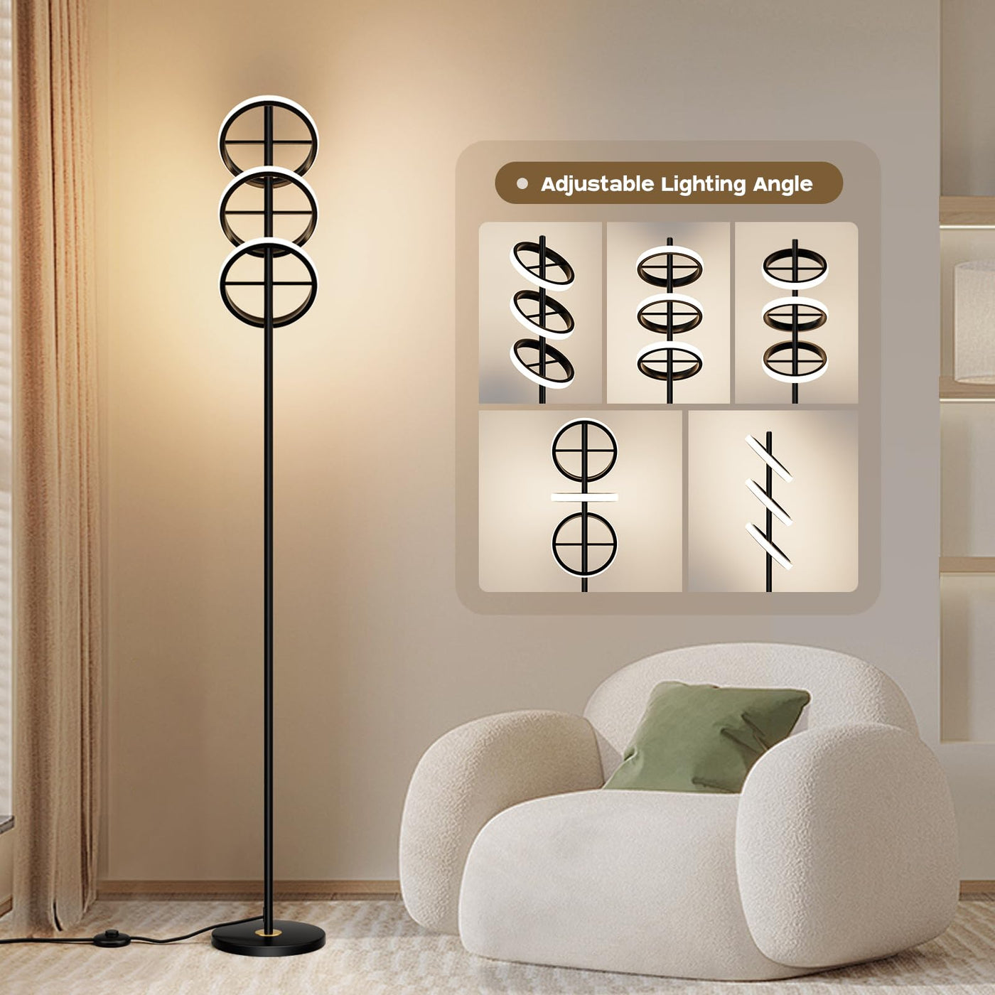 Q: What are the adjustable features of the FIGDIFOR Modern LED Floor Lamp?A: The FIGDIFOR Modern LED Floor Lamp features three independently adjustable LED rings, allowing you to customize the lighting angle according to your needs, whether in the bedroom, living room, or office.