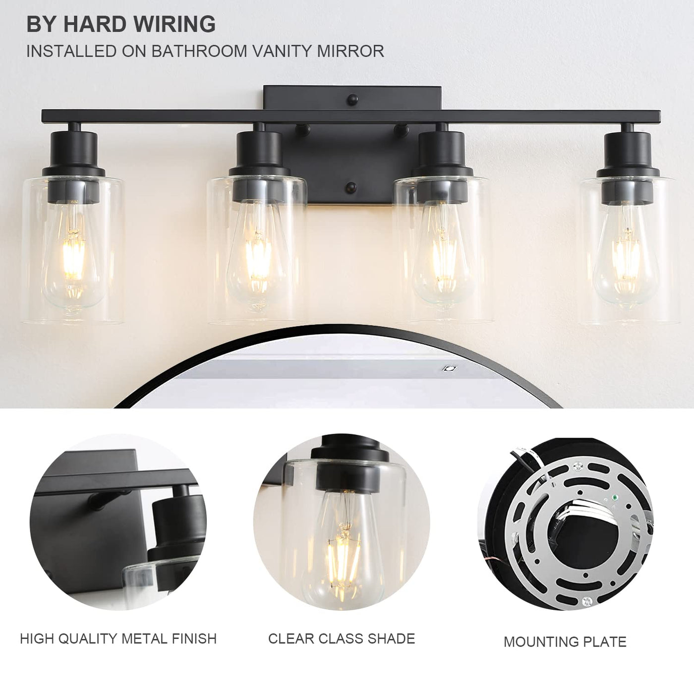 4-Lights Bathroom Light Fixtures, Matte Black Vanity Light with Clear Glass Shade,Modern Wall Sconce for Mirror Bedroom Hallway Farmhouse