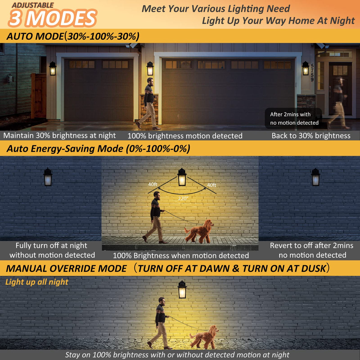 Q: How does the motion sensor work on the FILIYANO outdoor wall light?A: The FILIYANO Motion Sensor Outdoor Wall Light features a PIR Motion Sensor and Dusk to Dawn Photocell. This means it can detect motion within a range of 40 feet and 220 degrees, automatically adjusting brightness based on movement at night. It has three modes: fully off until motion is detected, a low brightness mode at dusk, and a manual override mode for extended lighting.