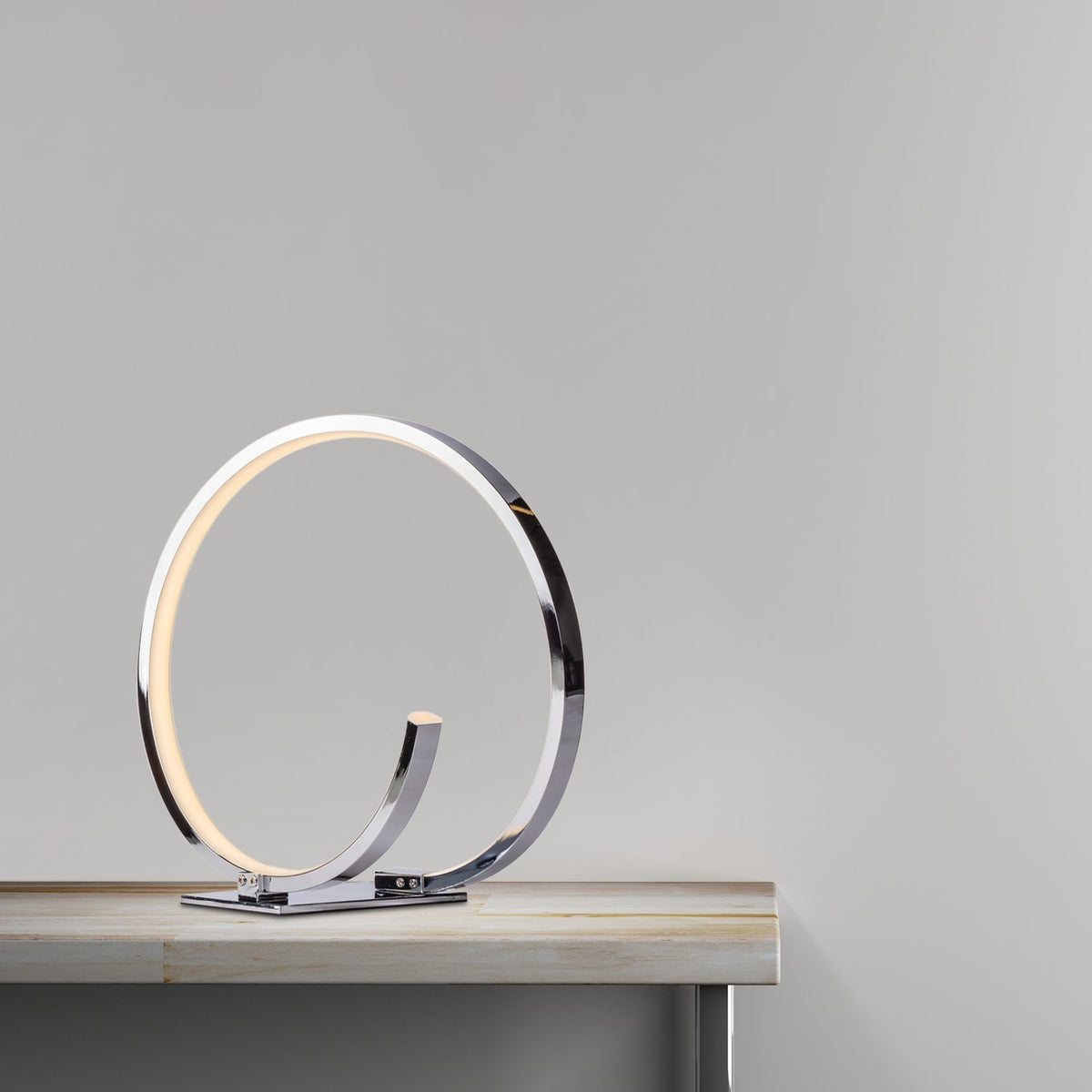 Q: How do I care for and clean the Finesse Decor Circular Design Table Lamp?A: To maintain its stylish appearance, simply wipe the lamp with a soft, damp cloth. Avoid using abrasive cleaners that could scratch the chrome finish.