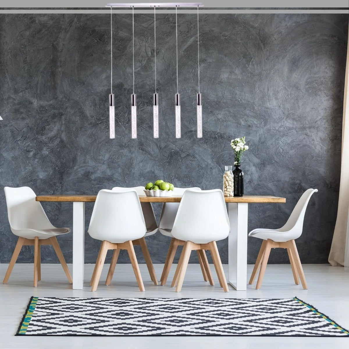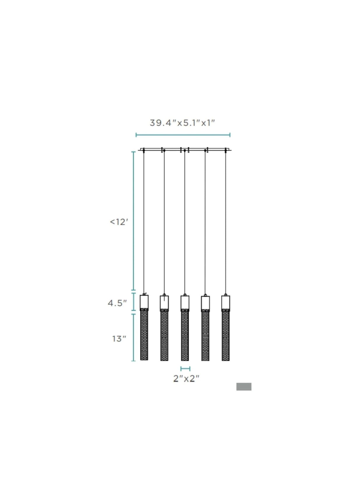 Finesse Decors sleek and modern five-piece Sparkling Night Cylinder Chandelier is a must-have product! The dazzling acrylic cylinders will illuminate any room with a radiant white light. Specs:5 GU10 LED BulbsCanopy: 39 x 5 x 1.5HSingle pendant: 2 x 2 x 17 inchesHANGING LENGTH (WIRE INFO): UP TO 12Material: Metal and Acrylic3 Years Limited Manufacturer Warranty
