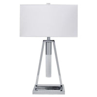 Q: What materials are used in the construction of the Finesse Decor Table Lamp?A: The Finesse Decor Table Lamp is made of a combination of metal, acrylic, and fabric/linen, featuring a stylish chrome metal finish.