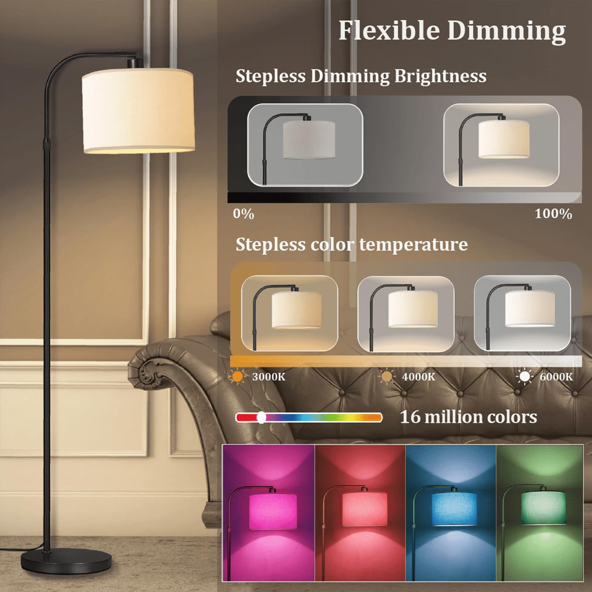 Black floor lamp with remote control, adjustable height arc dimmable floor lamp. (Note: remote 2*AAA batteries not included)
