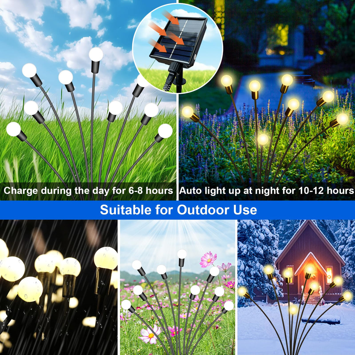 Q: Are the Firefly Lights suitable for outdoor use in all weather conditions?A: Yes, the Firefly Lights are made of IP65 waterproof material, allowing them to withstand rain, snow, and heat. They are perfect for outdoor decor in gardens, patios, yards, and other areas, making them ideal for various occasions.