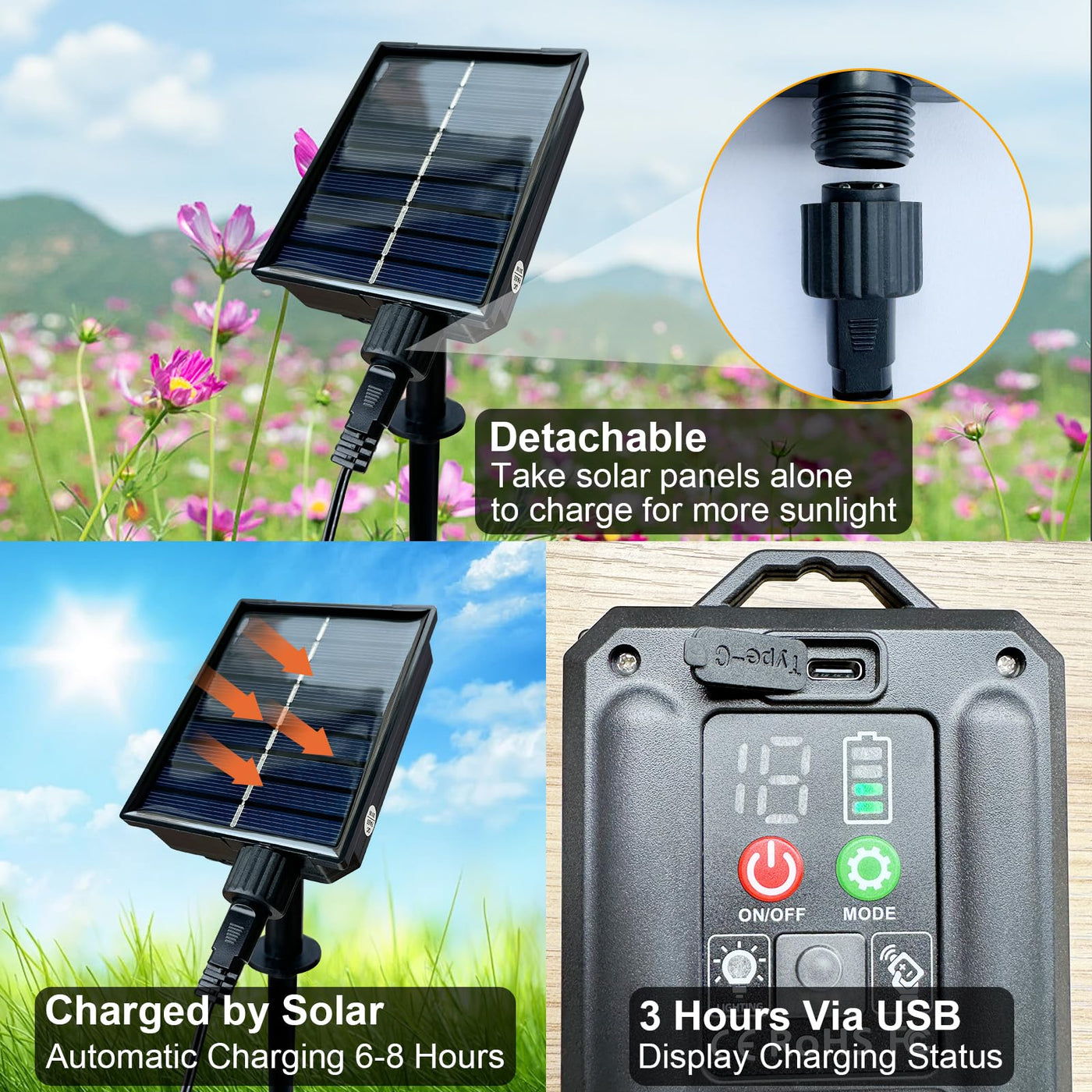 Q: How do the Firefly Lights charge?A: The Firefly Lights can be charged via solar energy or USB. The solar panel features a 1200mAh Ni-MH battery, allowing for 6-8 hours of sunlight charging, which provides over 10-12 hours of illumination at night. For rainy days, USB charging is available and takes about 3 hours for a full charge.