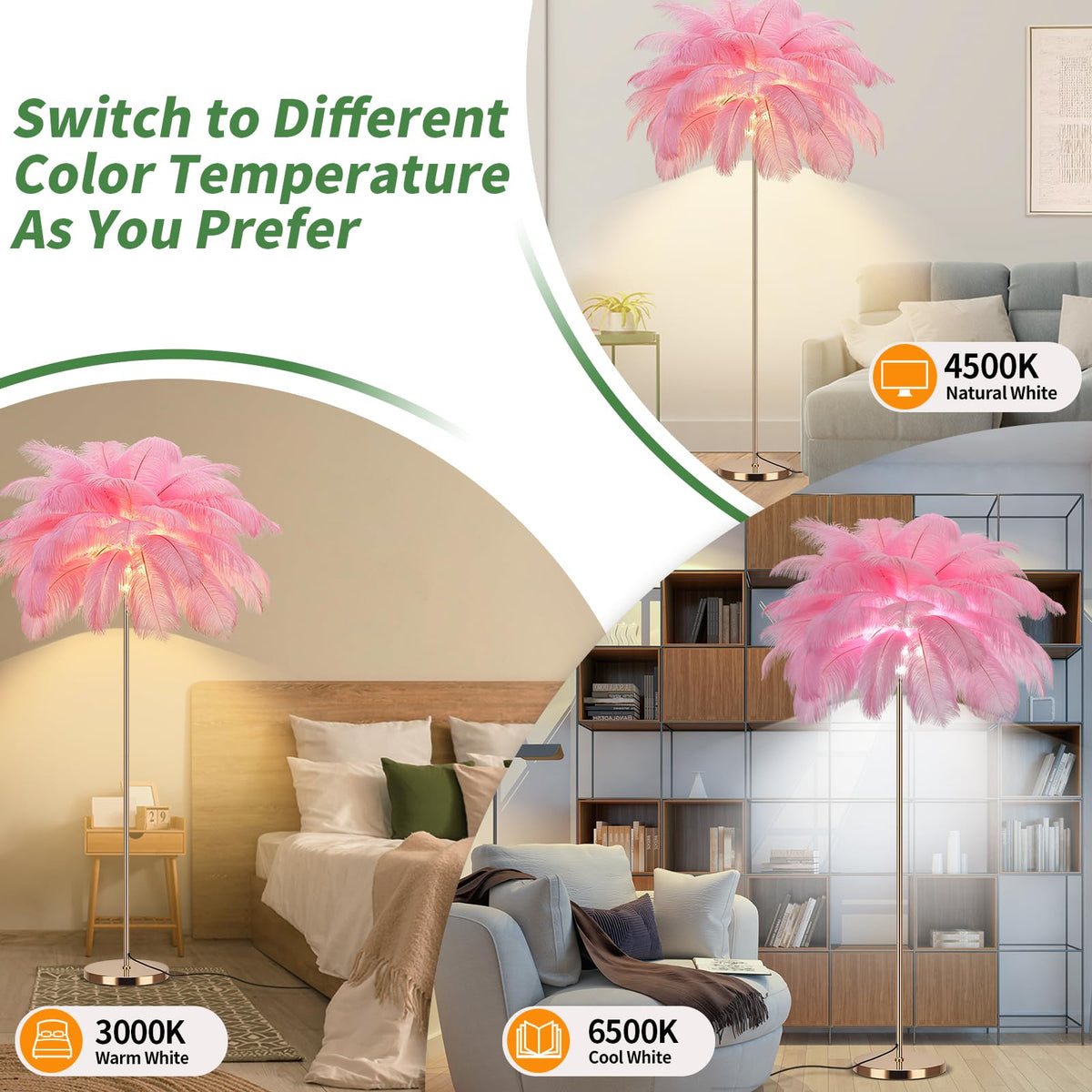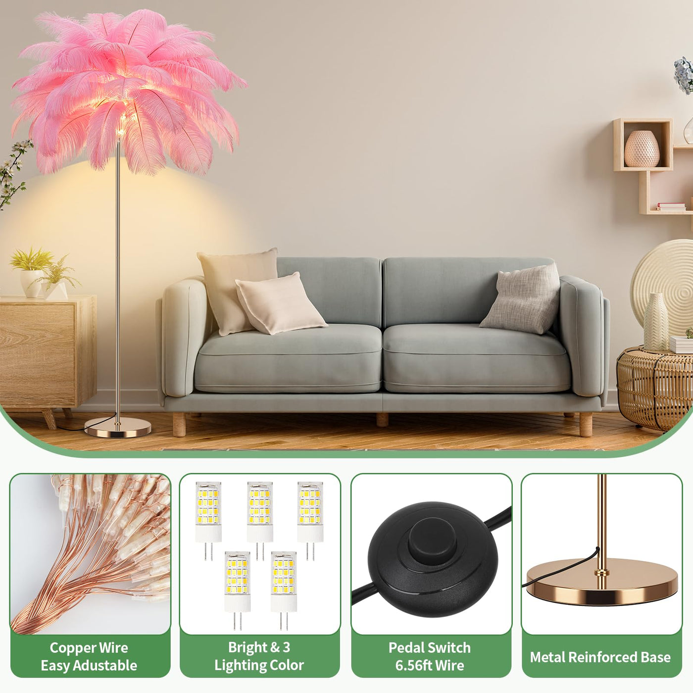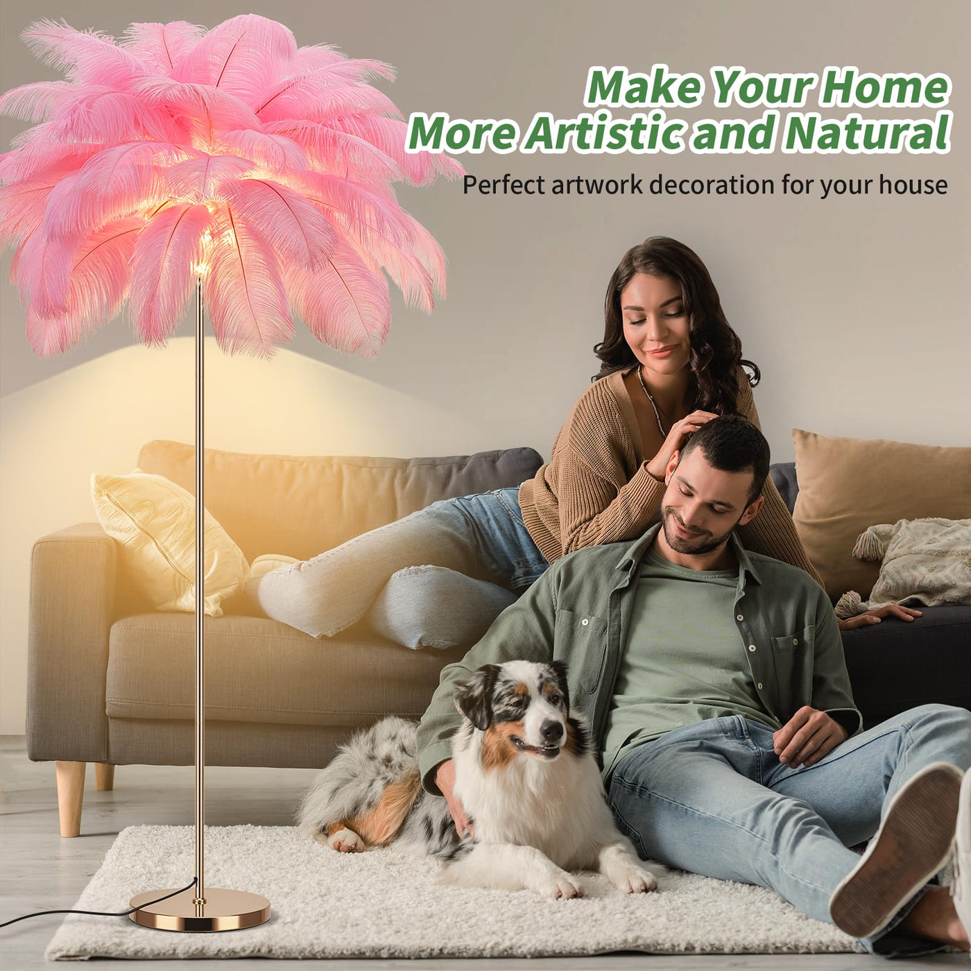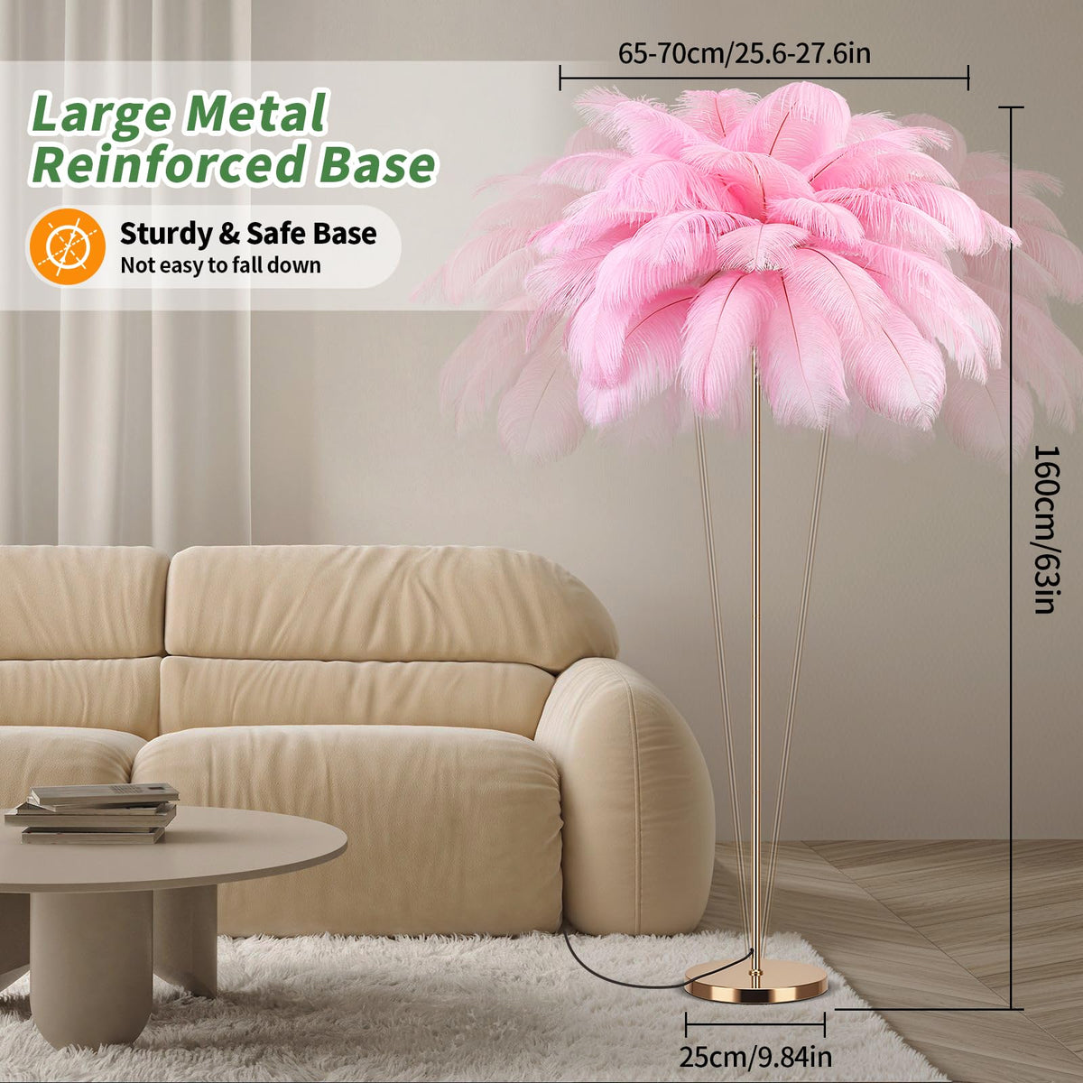 This pink ostrich feather lamp is tall floor lamp for living room, 63 inch height. The feather floor lamp has 48pcs pink ostrich feathers, 3 color temperature. The standing lamp bedroom has sturdy metal body and large base to make it not easy to fall down and be tip-resistant. The fluffly feathers are great ideal to decor your home. The modern stand up light for bedroom living room is well packed and not mess.