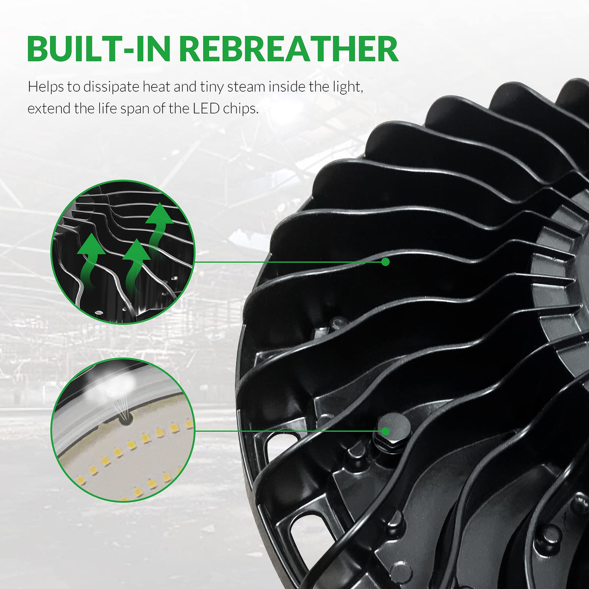 Why choose this UFO LED High Bay Light?Super Bright for Large Areas Our high bay light adopts premium Epistar 3030 LED chip to provide super bright illumination 21,000LM for all kinds of large spaces with high ceilings including warehouses, factories, basements, gymnasiums, garages, supermarkets, large stages etc. Waterproof for Both Indoors and Outdoors This high bay light features IP65 waterproof grade, no need to worry about using it in damp environments. You can also use it outdoors on rainy days with confidence, great for both indoors and outdoors. Durable for Long-time Usage Equipped anti-corrosion die-casting aluminum housing with good thermal conductivity, this ensure an excellent protection and heat dissipation to expand Flakeeper LED fixture’s lifespan. The lifespan of this light reaches up to more than 50,000 hours (about 23years on 6hours/day working), it will serve you for a long time to meet your daily needs. Friendly to Human Eyes The 5000K CCT and CRI greater than 90, compared with other CRI only greater than 80 highbay lights, it ensure comfortableness to your eyes to make them easily recognize the object because the light can highly restore the true color of items. Easy Installation and Reliable Safety Standards Unlike others’ 40cm power cord, LED high bay light features 5FT UL certified super long power cord which keeps you away of wiring and frustrating of power cord length insufficient issue. Besides, it also comes with a safety rope which add an additional protection for the installation. Moreover, this LED high bay light is ETL listed. ETL is a reliable safety standard so you could using this light with more confidence. Power: 150W Power Factor: >90% Input Voltage: AC100-277V LED Chip: SMD3030, 130-150Lm/W Luminous Flux(lm): 21,000Lm CCT: 5000K CRI: >90 Beam Angle: 120° Materials: Aluminum+PC