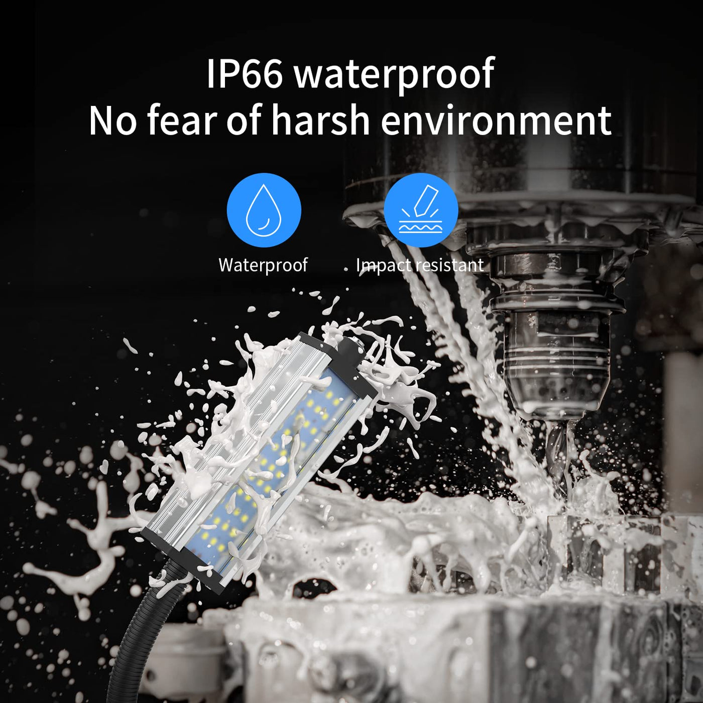 Q: What is the waterproof rating of the Flexible Work Light?A: The Flexible Work Light has an IP66 waterproof rating, which means it is resistant to water spray and suitable for use in environments where water exposure is common, such as machine tools and industrial settings.