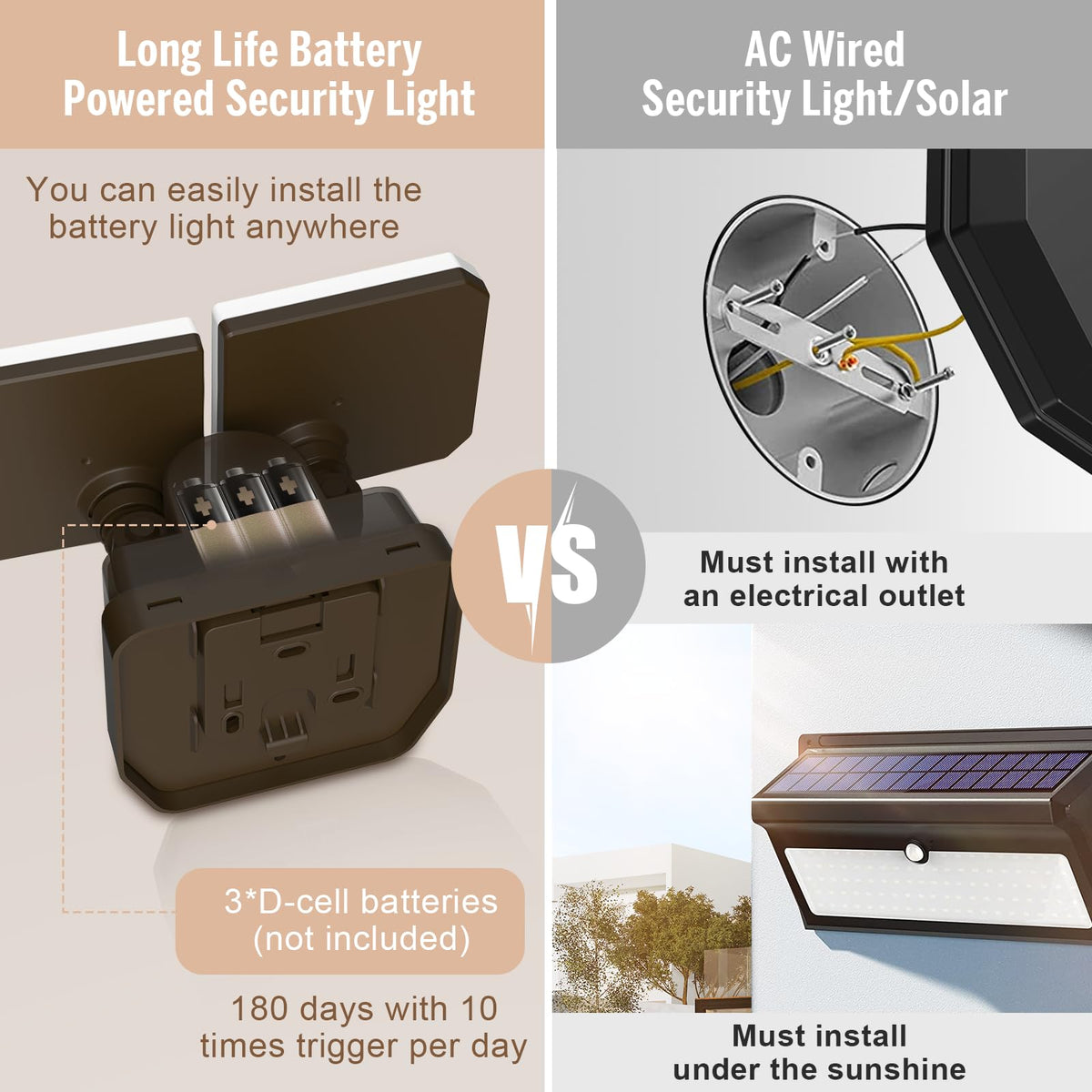 Q: How long does the battery of the FLITI Battery Powered Flood Light last?A: The FLITI Battery Powered Flood Light has a 6-month battery life, requiring only 3 D-cell batteries for operation. Depending on usage, you may need to replace the batteries 1-2 times a year.